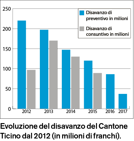 Considerando i dati della statistica, tuttavia, si ha l’impressione che, nel corso degli ultimi anni, il nostro governo ha preso un po’ sottogamba quello che piano finanziario e preventivo gli dettavano in materia di spesa. Ad eccezione del 2012, anno nel quale il Cantone spese di meno di quanto aveva preventivato, tutti gli altri consuntivi si sono chiusi con eccedenze di spesa rispetto al preventivo. Queste eccedenze sono direttamente correlate alle differenze in più in materia di ricavi. Di fatto, quindi, gli obiettivi di riduzione della spesa dei documenti di previsione non sono mai stati rispettati. Ora il progetto di preventivo 2017 prevede di ridurre il disavanzo a 34 milioni di franchi, ossia a meno della metà dell’ultimo disavanzo accertato, quello del 2015. Intende farlo soprattutto amministrando con grande rigore la spesa. L’esperienza del recente passato ci dice che sarà difficile raggiungere questo obiettivo. A meno che, e questo nessuno se lo augura, i ricavi aumentino molto meno di quanto il preventivo preveda. Il freno alla spesa diventa veramente effettivo solo quando scarseggiano le risorse.