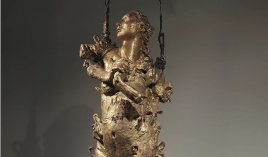 Nel percorso di mostra colpisce per impatto visivo Mujer Suspendida, un’opera del 2015 in resina ricoperta di pittura dorata. Appesa al soffitto, questa scultura dalle forme abbondanti mutilate e ricucite richiama nella parte superiore la figura di una santa martire, con l’espressione devota e le mani giunte, e nella parte inferiore la figura del Cristo crocefisso. Per metà femminile e per metà maschile, carnale e spirituale insieme, è metafora e sintesi degli opposti che dimorano nella natura umana.