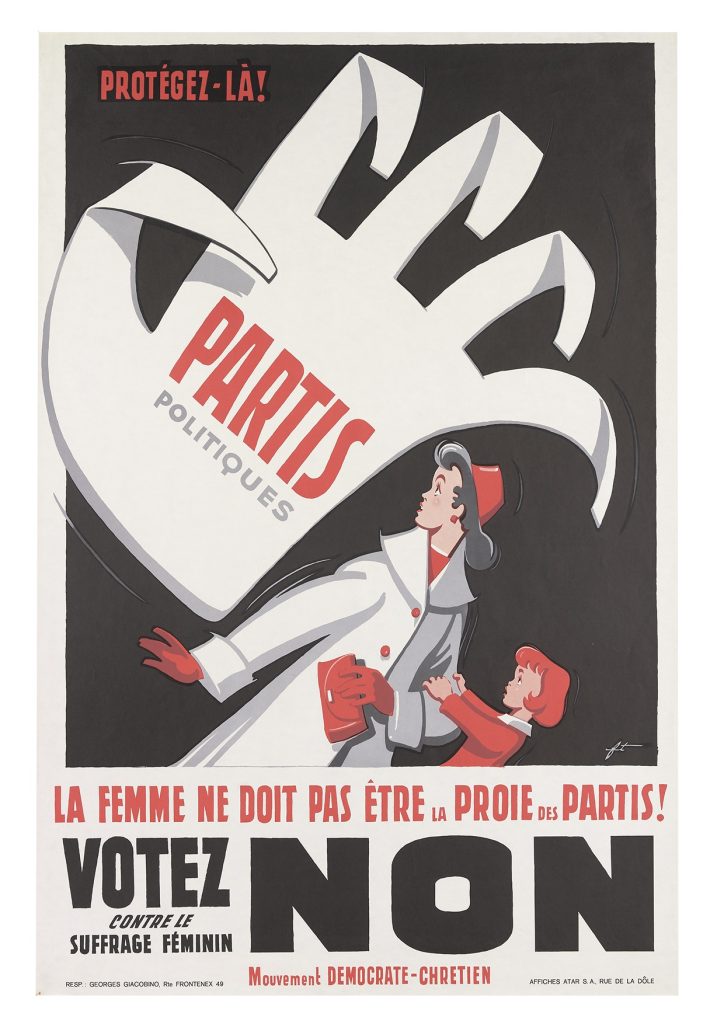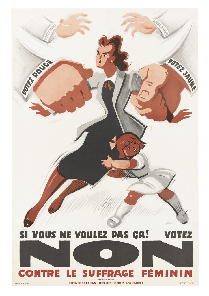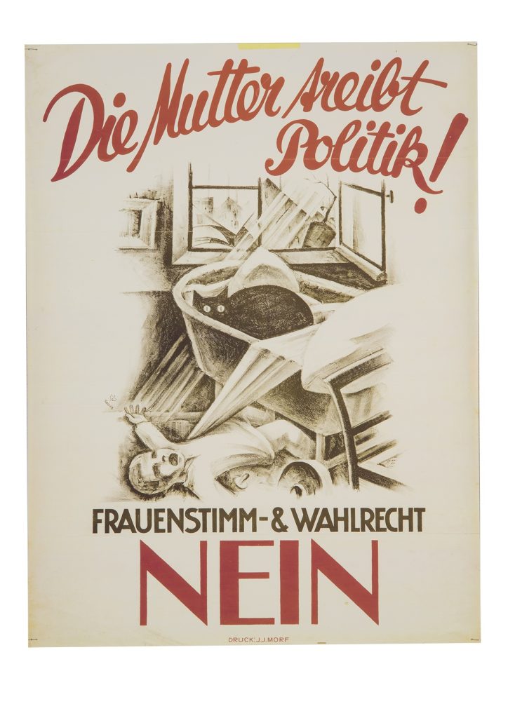 Si tratta di manifesti dalle tinte forti, che ricordano vagamente il cinema espressionista tedesco, voluti dalla popolazione stessa per dissuadere i compatrioti dal compiere «l’errato passo» del suffragio universale, passo che all’epoca il resto dell’Europa aveva però già compiuto da un po’. Violenza verbale, cliché maschilisti e allarmismo, si scontrano in questa lotta per immagini alla dolce eleganza dai toni più pacati della campagna favorevole al diritto di voto, con meno presa sulla popolazione, ma alla fine vincente.