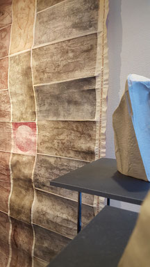 Anche Loredana Müller lavora con la materia, usa pigmenti naturali, fuliggine, inchiostri, ossidi della Val Morobbia, terre che raccoglie, carta povera che fabbrica lei stessa. Le sue pagine incise alle pareti, benché non sia evidente, accomunano la sua ricerca a quella della ceramista, tra spirito e materia. Hanno nomi come Erbe di luglio, erbe dei lupi, erbe d’autunno, vivono di un’atmosfera speciale intrisa di poesia, ricordano pareti affrescate ma anche la luce di certe giornate invernali o le prime luci dell’alba, quando il sole sta per sorgere. Come in un erbario fossile i racemi restano imprigionati e impressi sulla pagina, indicano stagioni e fiori sognati, sono pagine dalle cromature forti, incisioni morbide come pastelli che non sembrano originate da matrici metalliche, il colore appare rarefatto, il segno lieve fatto di sapienti successioni di passaggi al torchio. A conclusione della mostra vi sono dei libri d’artista: Areapangeart collabora da sempre con editori e autori, produce piccoli libri d’arte dove le incisioni affiancano le parole.