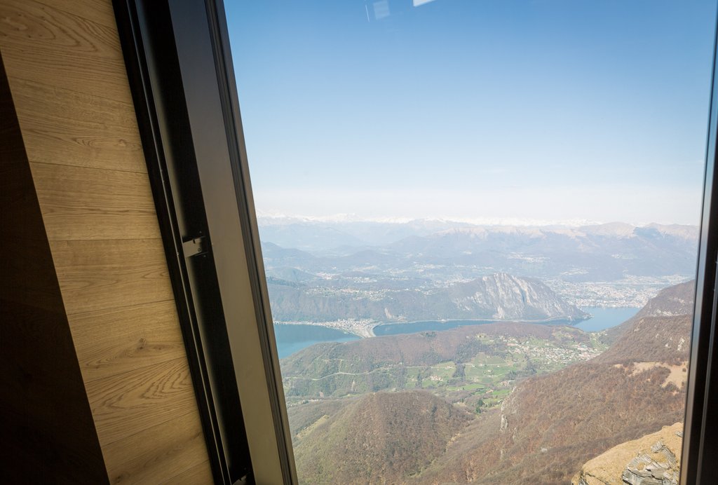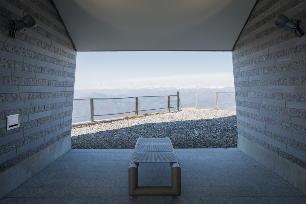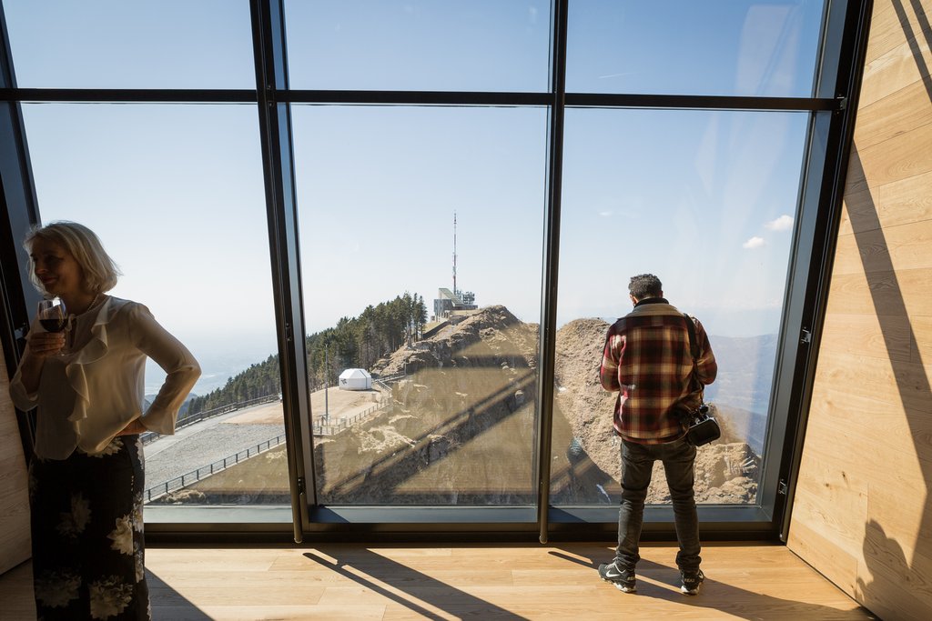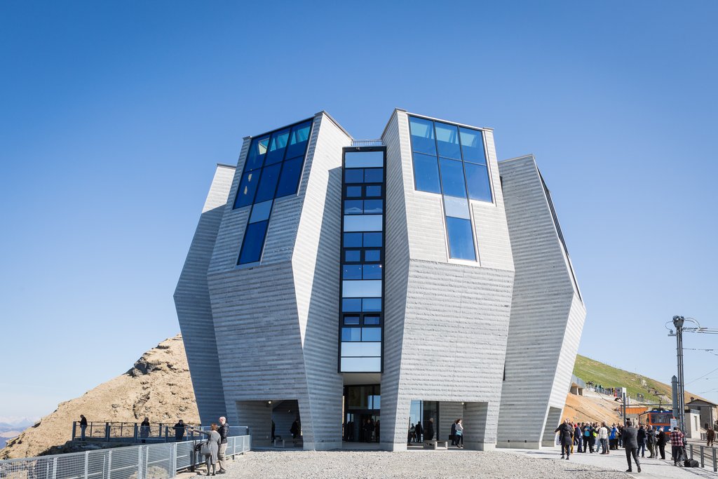 Eccolo, dunque, il «Fiore di Pietra», l’ultima opera dell’archi-star Mario Botta: risplende nitido in questa giornata inondata dalla luce del sole, con la sua forma ottagonale, le sue torri di cinque piani, i suoi petali che dapprima si sporgono verso l’esterno e poi si richiudono ai piani alti, le pareti esterne in pietra grigia con strisce alternate lisce o a spacco, come le descrive il suo creatore. L’inaugurazione non poteva svolgersi sotto auspici migliori, la giornata soleggiata e senza nubi, la vista a 360 gradi sulle Alpi, le Prealpi e la pianura padana ha immediatamente proiettato i 200 ospiti in una dimensione sospesa, dove la solidità della montagna e del «Fiore di Pietra» faceva da contrappunto alla vastità del cielo, instillando in tutti un senso di stupore.