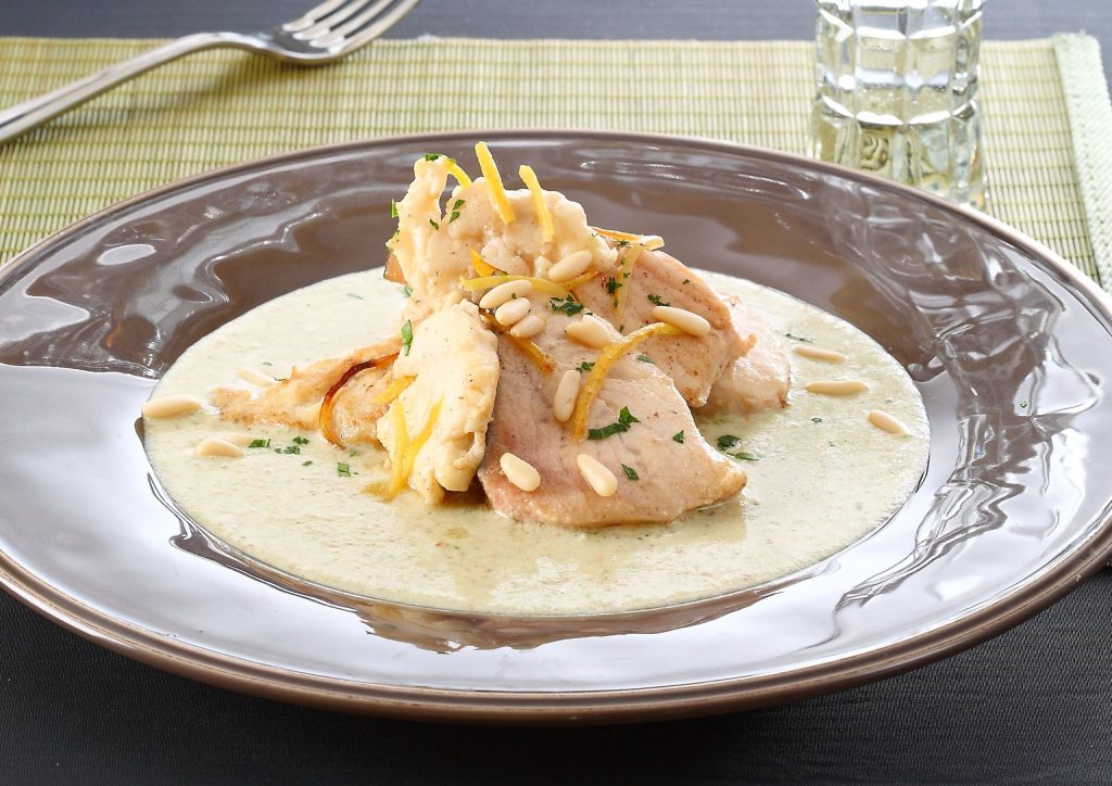 Ingredienti per 4 persone: 4 filetti di pesce da 200 g l’uno · 1 limone · pinoli · olio d’oliva. Per la salsa: 400 g di sedano · 2 fette di pane integrale · 1 patata cotta · 1 spicchio di aglio · 1 dl di brodo di pesce (o vegetale) · 1 cucchiaio di succo di limone · 1 cucchiaio di prezzemolo · sale.