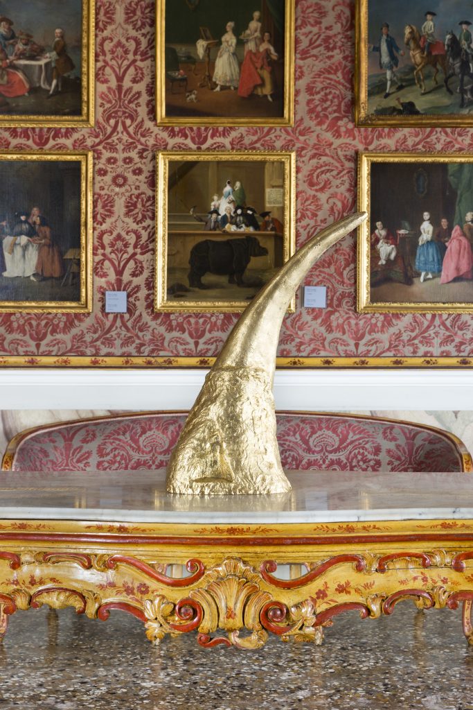 Marzia Migliora si confronta con le opere del Museo di Ca’ Rezzonico che espone il Settecento veneziano. Lo fa interagendo con la storia e la cultura del luogo in un ambiente particolarmente suggestivo. La mostra si intitola Velme, termine che indica «quella porzione di fondale lagunare che emerge in occasione delle basse maree». Un ambiente a rischio, fra passato e presente. Cinque le installazioni dell’artista dislocate nelle sale; una più affascinante dell’altra, come La fabbrica illuminata che propone dei banchi da orafo sui quali è posizionato un blocco di salgemma. Commercio, forza lavoro, rapporto fra terra e acqua si confondono tra di loro nel portego del primo piano. Fra i dipinti di Longhi, invece, Migliora espone un corno in bronzo dorato per rimarcare la fragilità della natura. Nel dipinto di Longhi, infatti, il rinoceronte senza il suo corno appare come un animale da circo, inerme e indifeso. Ma è in Taci, anzi parla che l’artista svela il suo pensiero. La maschera bianca, detta Moréta, con solo due fori per gli occhi si poteva indossare unicamente stringendo fra i denti una mordacchia. La dama dell’epoca non poteva quindi parlare, come il rinoceronte, bellezza esotica silente.