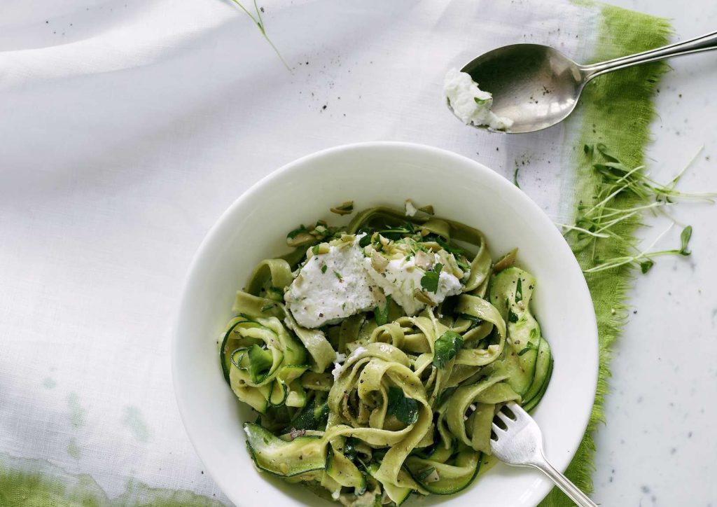 Ingredienti per 4 persone: 300 g di tagliatelle verdi · 4 zucchine piccole di ca. 150 g l’una · 2 cucchiai di olio di oliva · 1 spicchio d’aglio · 4 dl di panna semigrassa · 150 g di olive verdi snocciolate · 20 g di crescione · mezzo mazzetto di erbe aromatiche miste (es. basilico, prezzemolo ed erba cipollina) · 2 formaggi freschi di capra di ca. 80 g · sale · pepe.