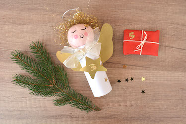 Dipingete la palline di ovatta con l’acrilico rosa pelle. Per lavorare comodamente potete fissarla su uno spiedino in legno e lasciare asciugare infilando lo spiedino in un vasetto. Una volta asciutto disegnate occhi e bocca con il pennarello nero e colorate le guance. Rivestite il rotolo di cartone con una striscia di 10x17cm bianca. Dal cartoncino oro ritagliate una stellina e delle ali. Con la colla a caldo fissate la pallina sul rotolo, abbellite con un nastro alla base della testa e incollate i capelli. Con poco filo metallico create un’aureola ( per esempio avvolgendolo attorno a un tappo di sughero) e infilatela nella testa. Decorate a piacere con piccole stelline dorate.