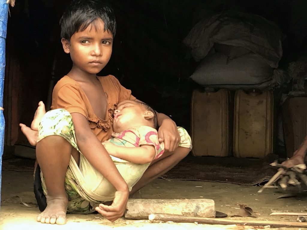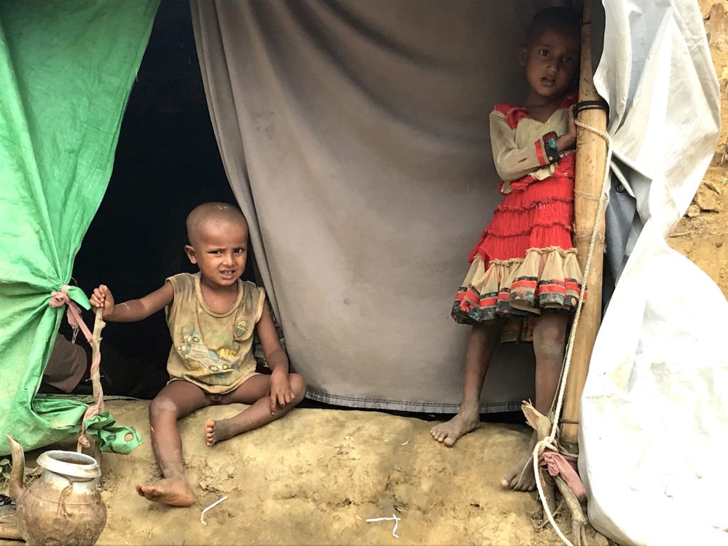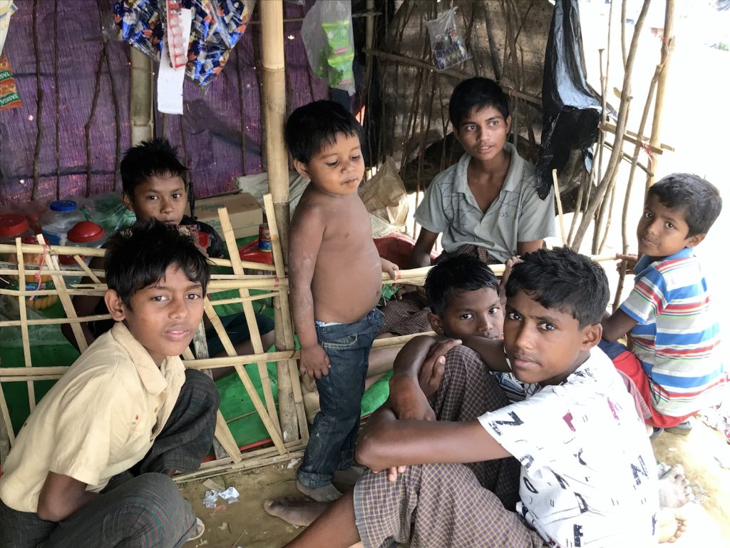 Innanzitutto ci sono i bambini. Bambini piccolissimi, bambini più grandi. Bambini che sorridono sempre o che piangono non appena posi lo sguardo su di loro. Bambini nudi, seminudi, vestiti con gli abiti della festa o con qualche straccetto alla buona. Bambini nati nei campi, bambini che vengono da molto lontano e si portano dentro agli occhi, o a volte nel corpo, ferite che forse non si rimargineranno mai. Sono venticinquemila i bambini senza genitori, nei campi dei rifugiati Rohingya. Venticinquemila senza genitori, altre decine di migliaia stretti come pulcini attorno a madri e nonne, in braccio a padri, sorelle e fratelli. Un esercito colorato ed eterogeneo che sciama a volte compatto a volte in rivoli come l’acqua di quel mondo, liquido a metà per la pioggia o per il mare e i fiumi, in cui si sono ritrovati a vivere.Un mondo d’acqua e di terra rossastra che diventa color dell’oro sotto il sole, un mondo di vegetazione lussureggiante e di infinite distese d’acqua che si confondono con il cielo. Un mondo sconosciuto, certo, ma un posto dove sentirsi finalmente al sicuro per ricominciare a vivere.