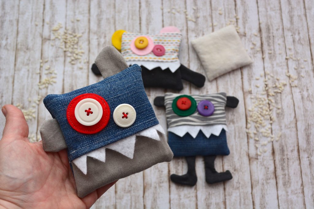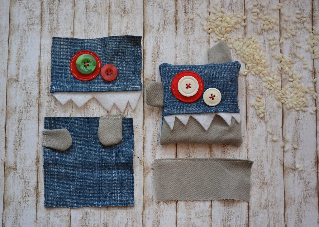 Dei simpatici mostrini da taschino, che spalancano la bocca lasciando intravvedere al loro interno un sacchetto di tela riempito con del riso. All’occorrenza il sacchetto interno può essere messo in microonde, per trasformare il mostrino in un piacevole scaldamani. Si possono realizzare con tessuti di riciclo, ricavati dai vestiti ormai smessi e cucirne tanti diversi variando la disposizione dei tessuti. Braccia e gambe lunghe o corte, occhi grandi o piccini… saranno i bambini di casa a disegnarne sempre di nuovi.