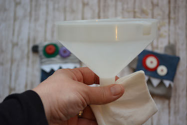 Cucite anche i due quadrati di tessuto bianco lasciando 2 cm per risvoltare. Risvoltate e aiutandovi con un imbuto riempiteli di riso. Chiudete l’apertura con punto nascosto e inserite il vostro cuscinetto nel piccolo mostro.