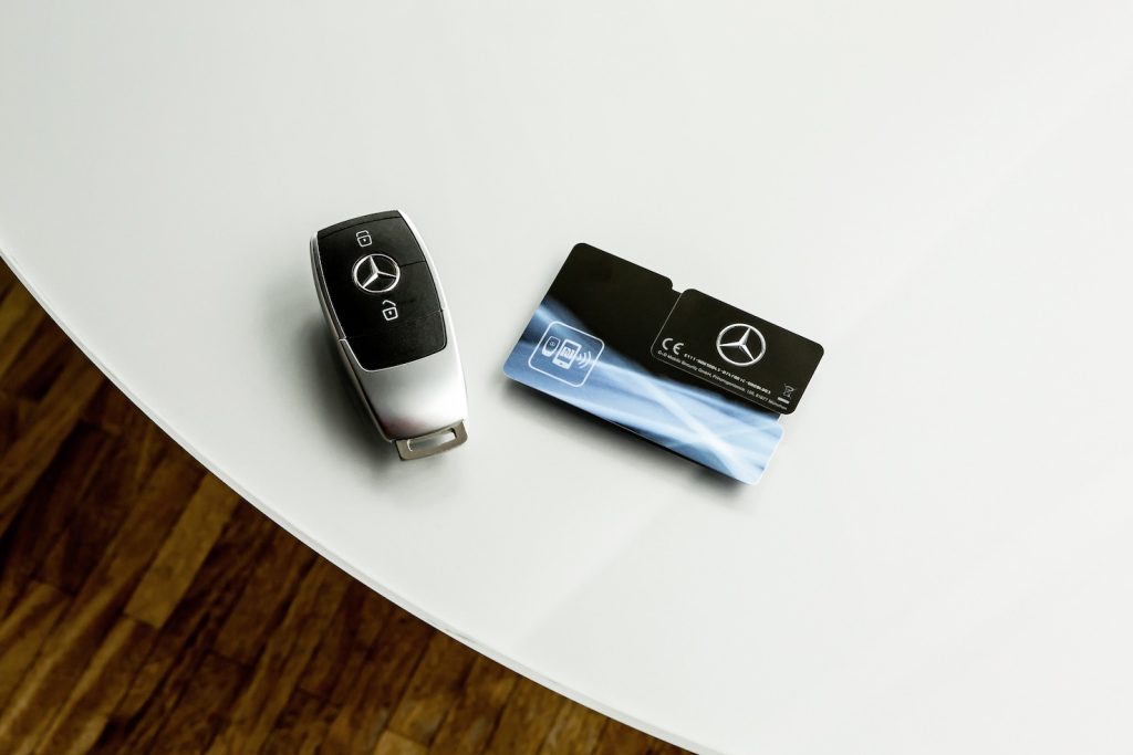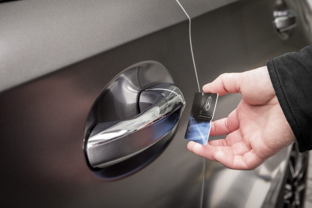 E se il telefonino si dovesse scaricare, cosa succede? Nessun problema. Il modulo NFC può essere integrato in un adesivo da apporre ovunque, anche sul proprio smartphone pur se privo di NFC. Basta avvicinare l’adesivo al vano portaoggetti della consolle centrale ed ecco che si può mettere in moto la Mercedes con la semplice pressione di un pulsante, senza utilizzare la chiave.