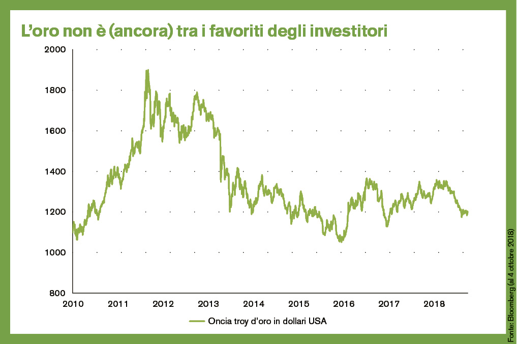 L’oro è tradizionalmente considerato un porto sicuro e gli ultimi mesi sono stati caratterizzati da un netto aumento dei rischi politici. Tuttavia, quest’anno il metallo prezioso non ha confermato il suo ruolo d’investimento rifugio in tempi di crisi. Nonostante le difficoltà politiche in Europa e le controversie commerciali tra USA e Cina, l’oro negli ultimi tempi ha nettamente perso terreno. Addirittura ha beneficiato ben poco anche dei timori inflazionistici che di tanto in tanto tornano di attualità . Quali sono i motivi di questa tendenza al ribasso?