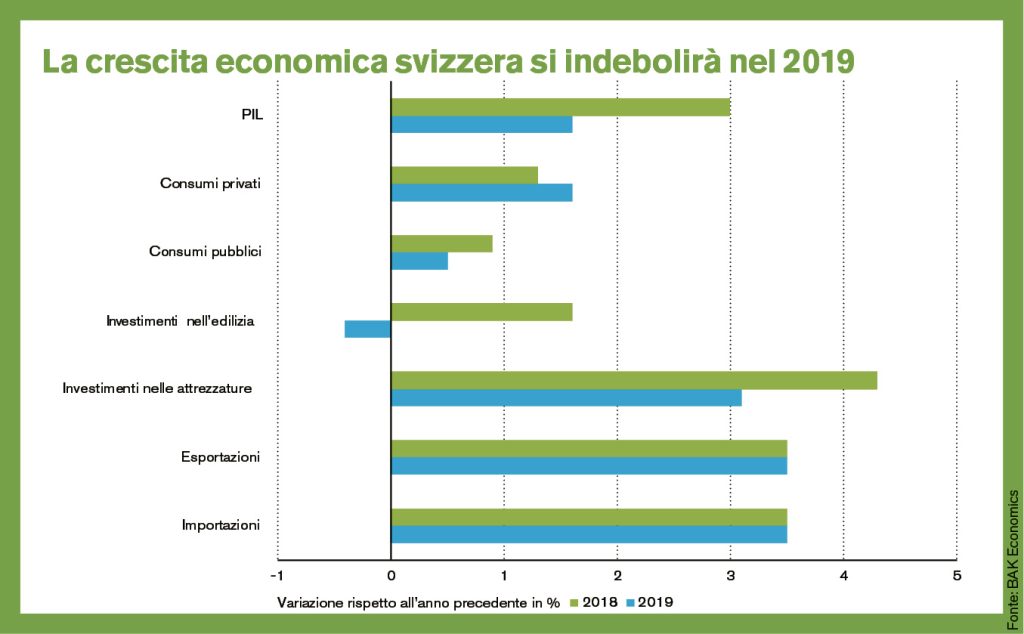 È pertanto prevedibile anche che nel 2019 la dinamica congiunturale in Svizzera rallenti leggermente. Con una crescita del PIL pari presumibilmente all’1,6%, l’economia svizzera continuerà tuttavia a incrementare la propria solida crescita. Sono diversi i motivi responsabili della normalizzazione del ritmo di crescita; in particolare, il vento a favore proveniente dal contesto internazionale che si placherà l’anno prossimo.