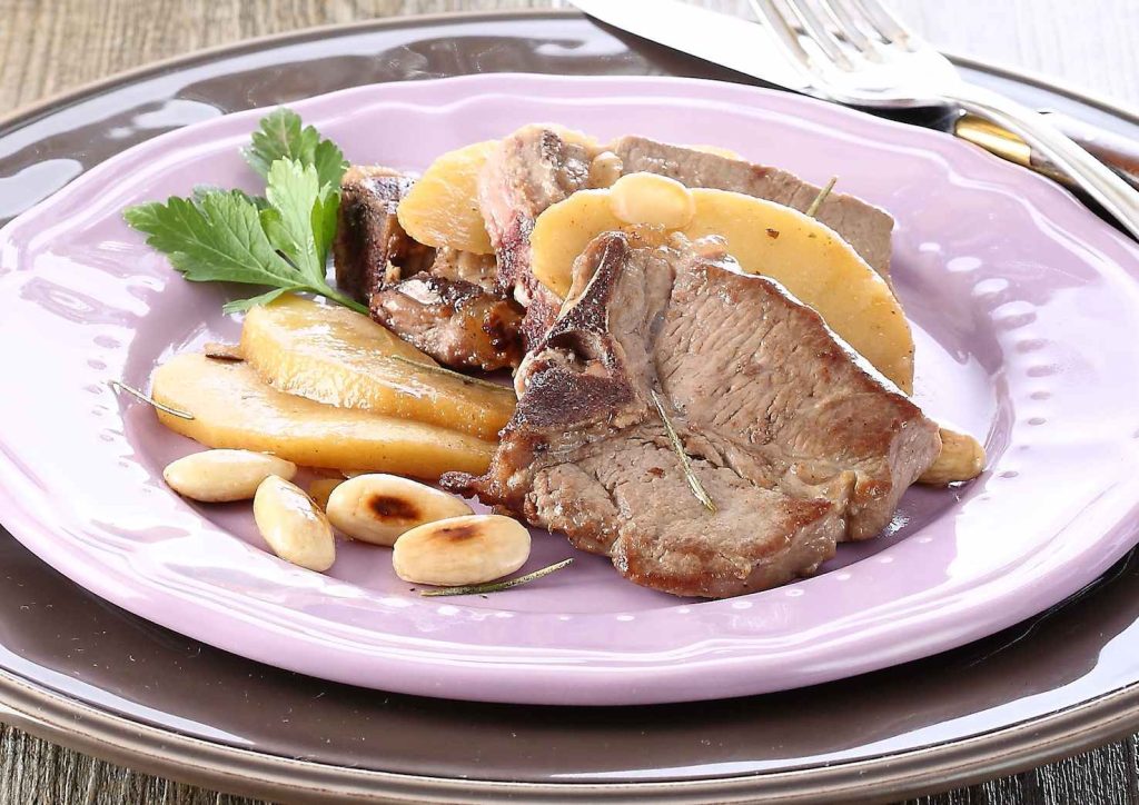 Ingredienti per 4 persone: 4 costolette di agnello · 4 mele · 1 manciata di mandorle · aglio · rosmarino · prezzemolo · vino bianco · olio di oliva · sale e pepe.