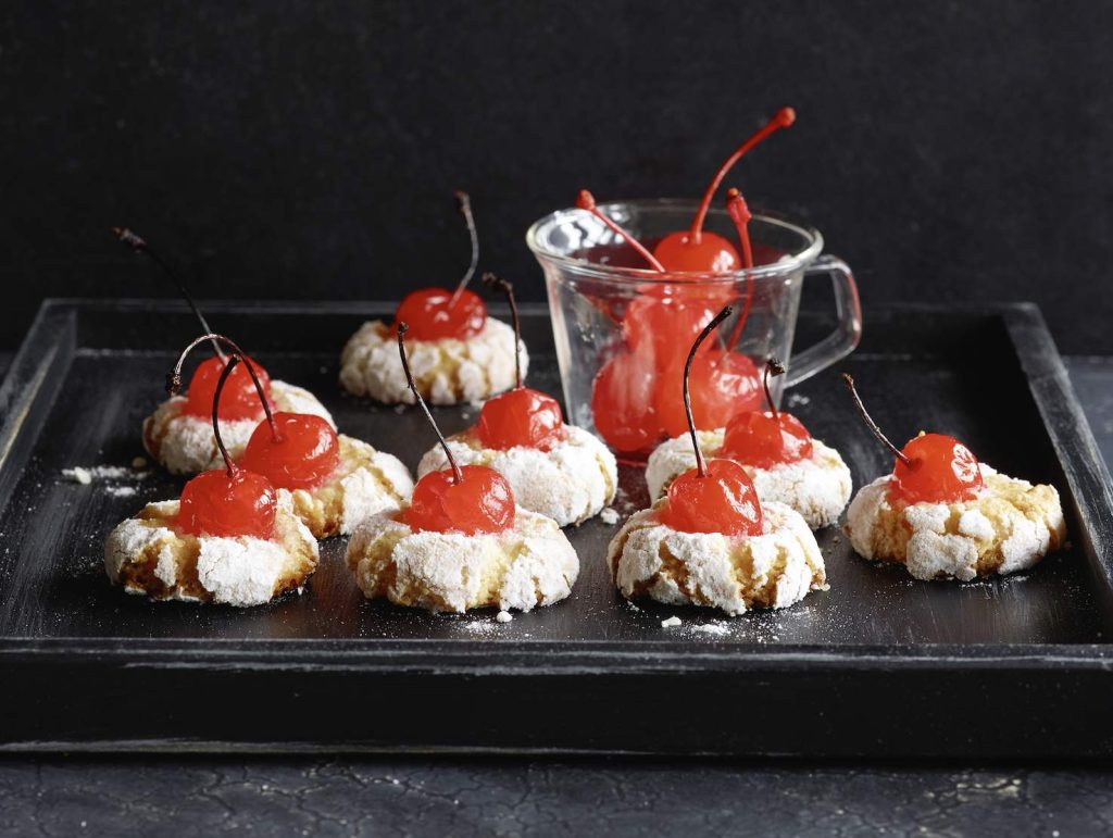 2. Scaldate il forno a 200 °C. Con l’impasto; formate circa 50 palline; dovrebbero essere un po’ più grandi delle ciliegie da cocktail. Passate le palline nello zucchero a velo in modo che siano ben ricoperte. Accomodatele sulle teglie foderate con carta da forno, lasciando un po’ di spazio tra una pallina e l’altra.