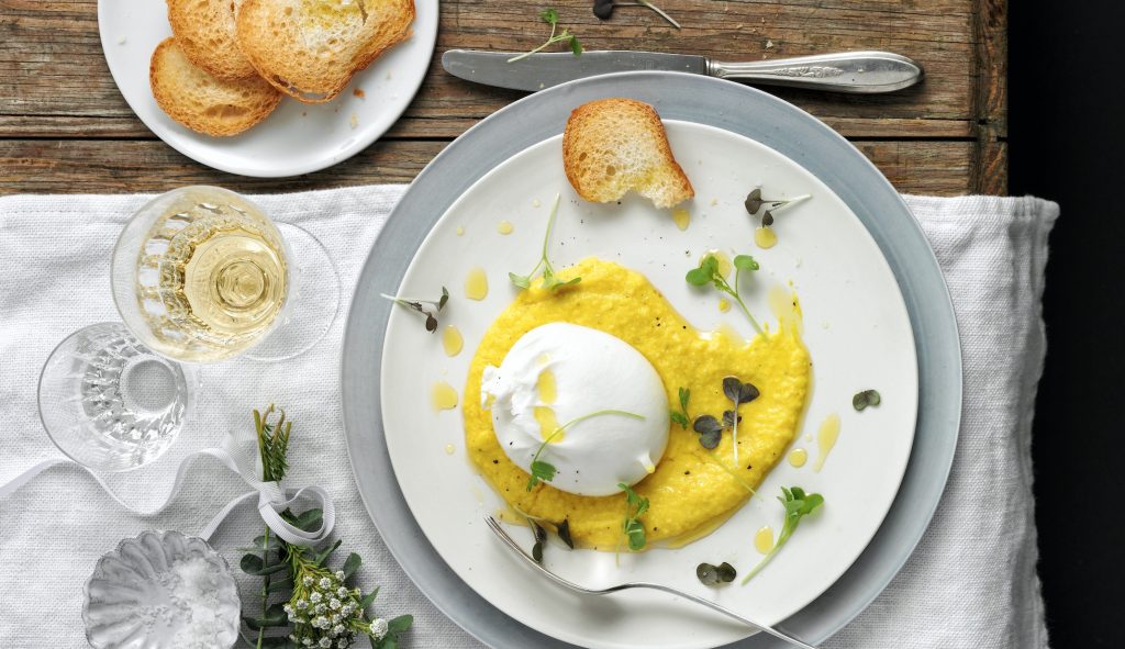 Ingredienti per 4 persone: ½ cipolla · 1 cucchiaio di burro · 230 g di chicchi di mais, peso sgocciolato · 2 prese di sale · pepe di Cayenna macinato grosso · 2,5 dl d’acqua · 40 g di semola di mais fine, polenta 2 minuti · 4 cc d’olio d’oliva · 4 burratine da 120 g · micro leaves o crescione per guarnire.