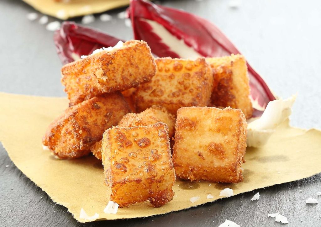 Versate il composto sul piano da lavoro e livellatelo a uno spessore di circa 2 centimetri. Quando è freddo, tagliatelo a dadi: passateli nel pangrattato e friggeteli, pochi per volta, in abbondante burro. Scolateli man mano su carta assorbente da cucina a perdere l’eccesso di unto.