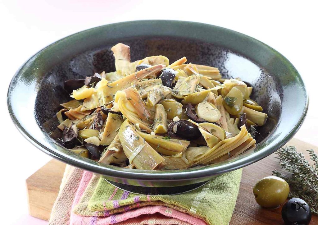 Ingredienti: 4 carciofi senza spine · 1 limone · 1 spicchio di aglio · 50 g di olive denocciolate · vino bianco secco · olio di oliva.