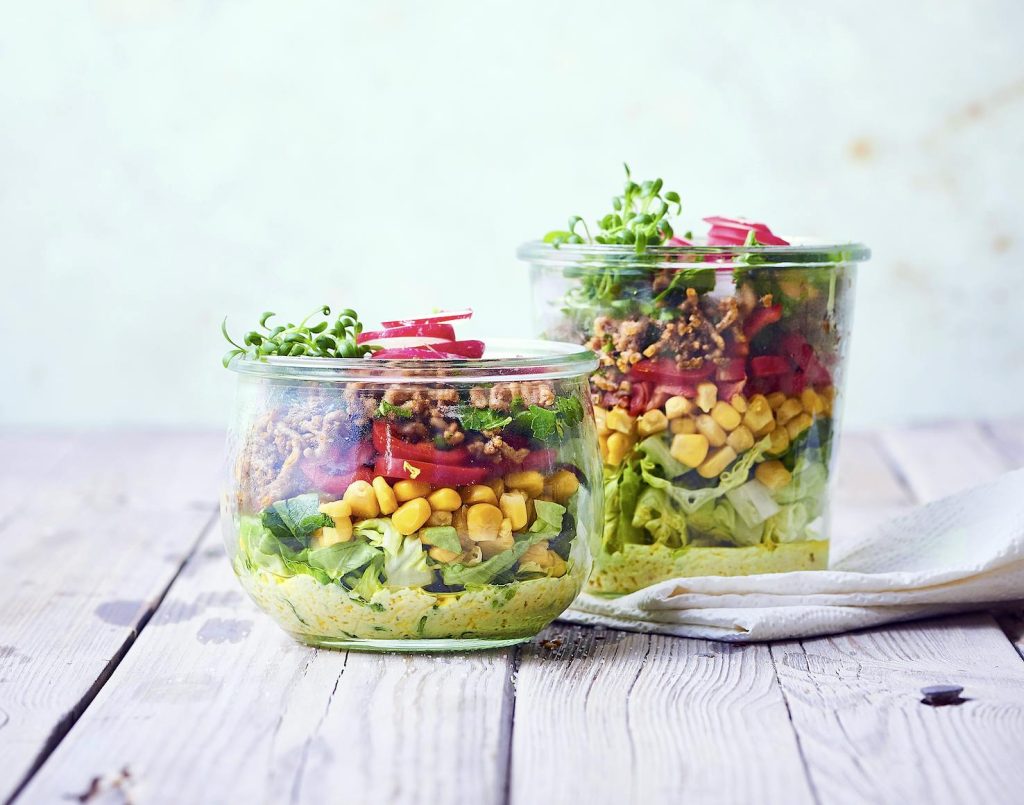 Ingredienti per 4 persone: 2 limoni · 2 peperoncini · 1 dl d’olio di colza · 500 g di carne macinata mista, ad es. manzo, maiale · 2 c di mix di peperoncino · sale · 2 mazzetti di prezzemolo · 2 scatole di chicchi di mais da 200 g · 2 c di senape · 3 c di yogurt al naturale · 6 c d’aceto balsamico bianco · 350 g di mini lattuga romana · 1 mazzetto di ravanelli · 20 g di crescione.
