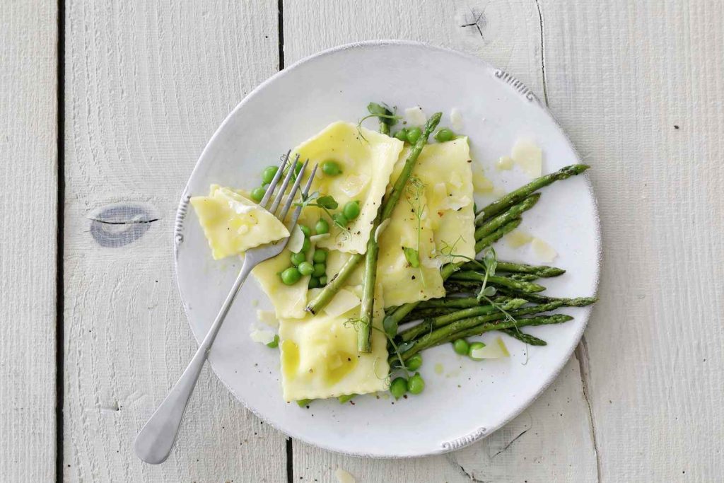 Ingredienti per 4 persone: 250 g di ricotta · 50 g di parmigiano grattugiato · 1 c di pangrattato · 1 limone · sale · pepe · 4 rotoli di pasta fresca già spianata · farina per spianare la pasta · 300 g d’asparagi verdi fini · 500 g di piselli nel baccello · 0,5 dl d’olio d’oliva · parmigiano e germogli per guarnire.