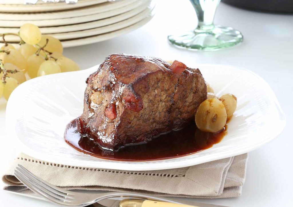 Ingredienti per 4 persone: 600 g di filetto di manzo · 80 g di prosciutto crudo in una sola fetta · 400 g di uva bianca matura · 100 g di mirtilli · 1 cucchiaio di zucchero · burro · sale e pepe.