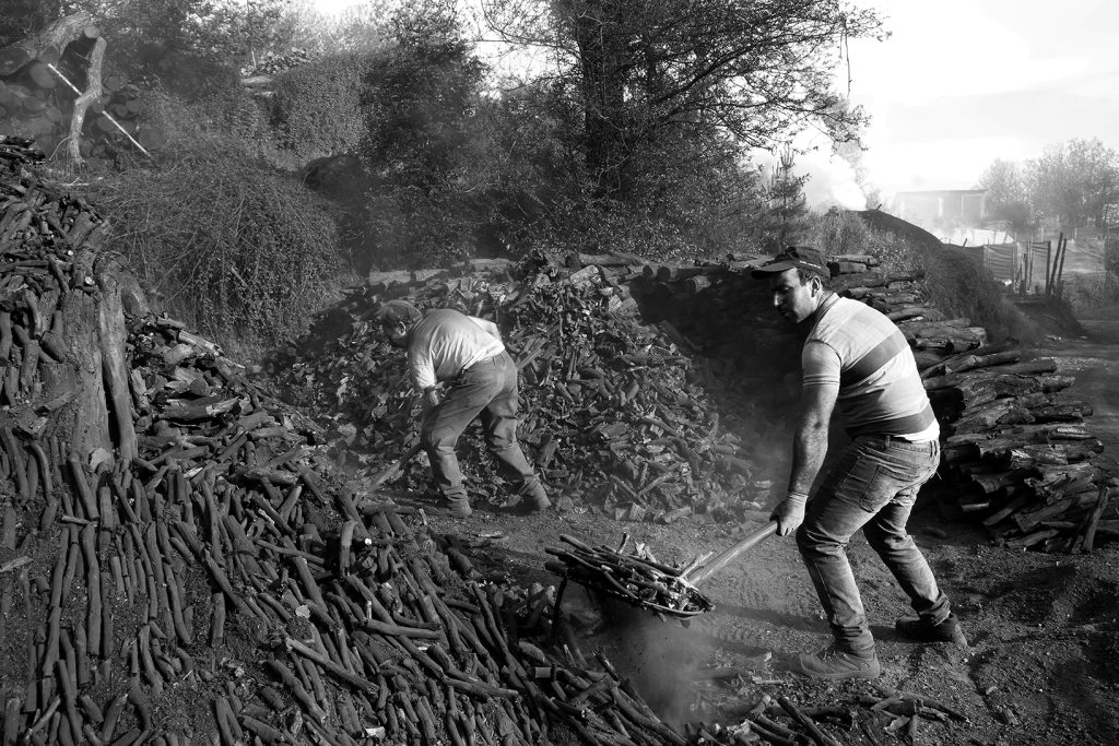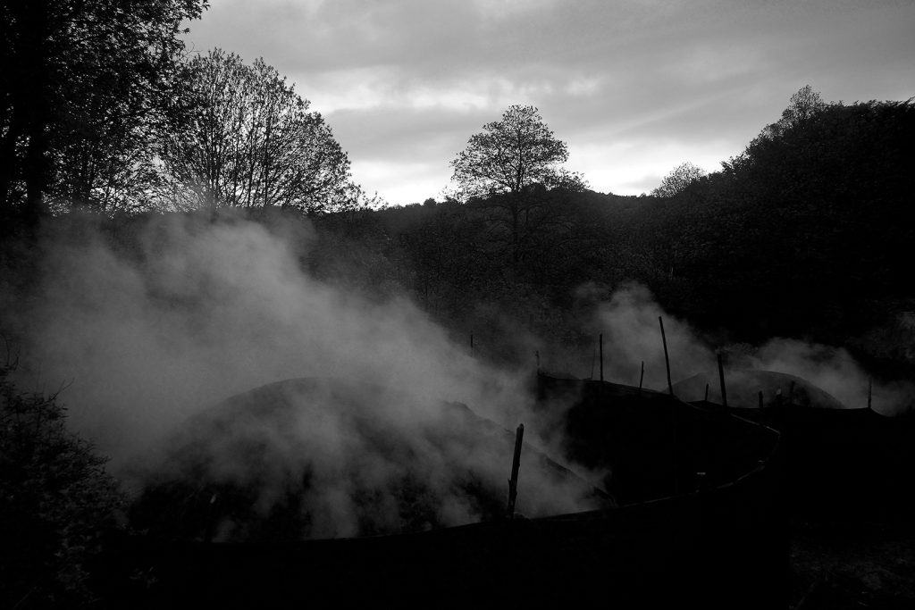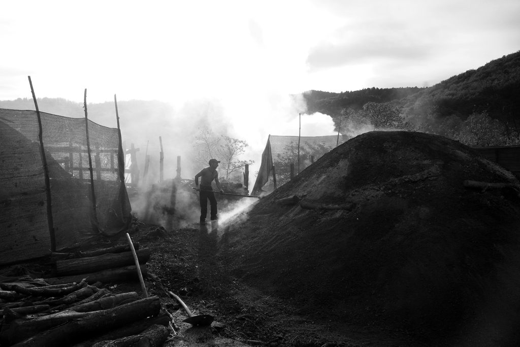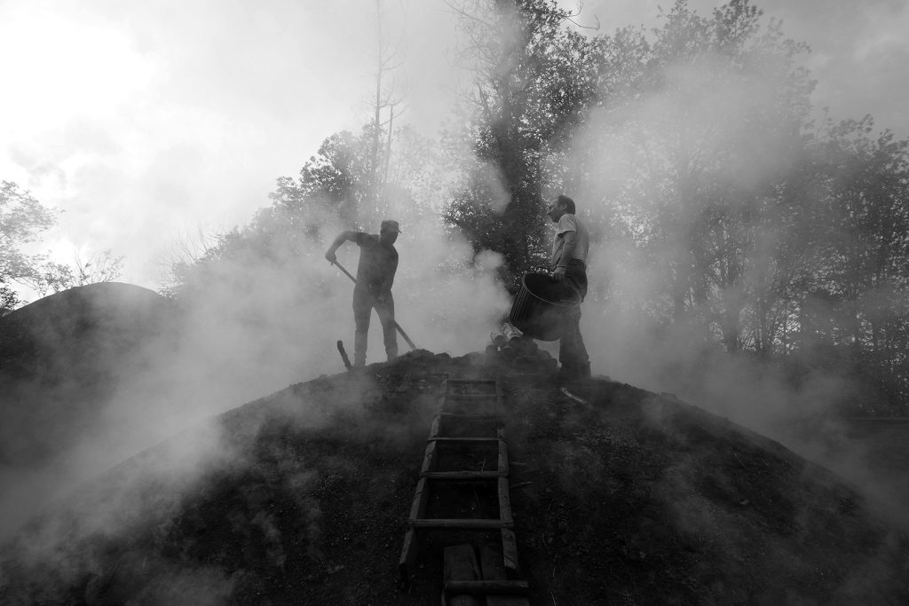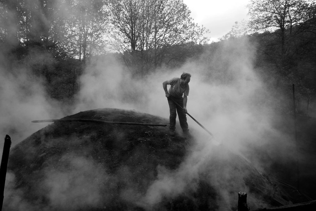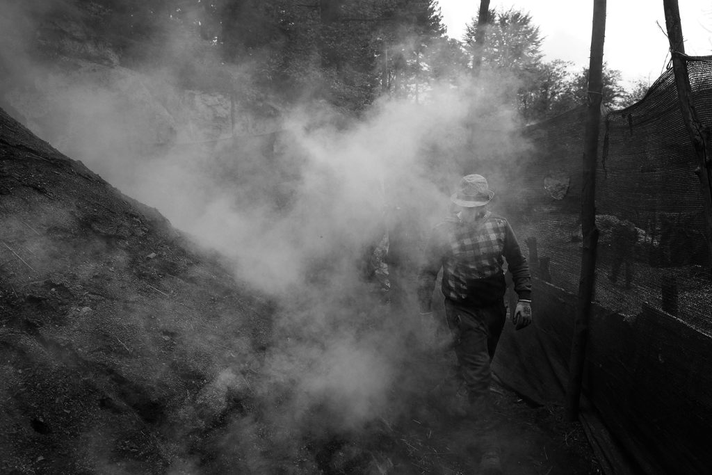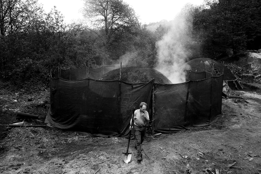 Camminando tra questi piccoli vulcani costruiti dall’uomo, osservo Angelo, 57 anni. Oggi è la giornata del «raccolto», una carbonaia ha finito il suo ciclo, ha trasformato tutta la legna in carbone. Bisogna scoperchiarla, togliere la terra, raccogliere e sistemare il carbone. Nuvole di polvere nera si alzano ovunque. Ma lui si muove rapido, sa da dove iniziare, impartisce brevi ordini e consigli al figlio che lavora con lui. In poco tempo il volto di entrambi è diventato una maschera nera. Risaltano solo gli occhi. Con esperienza dividono il carbone, nelle varie misure. Angelo, la schiena curva per raccogliere il carbone, si ferma raramente per riposarsi. E alza lo sguardo solo per controllare il fumo che esce dalle altre carbonaie.