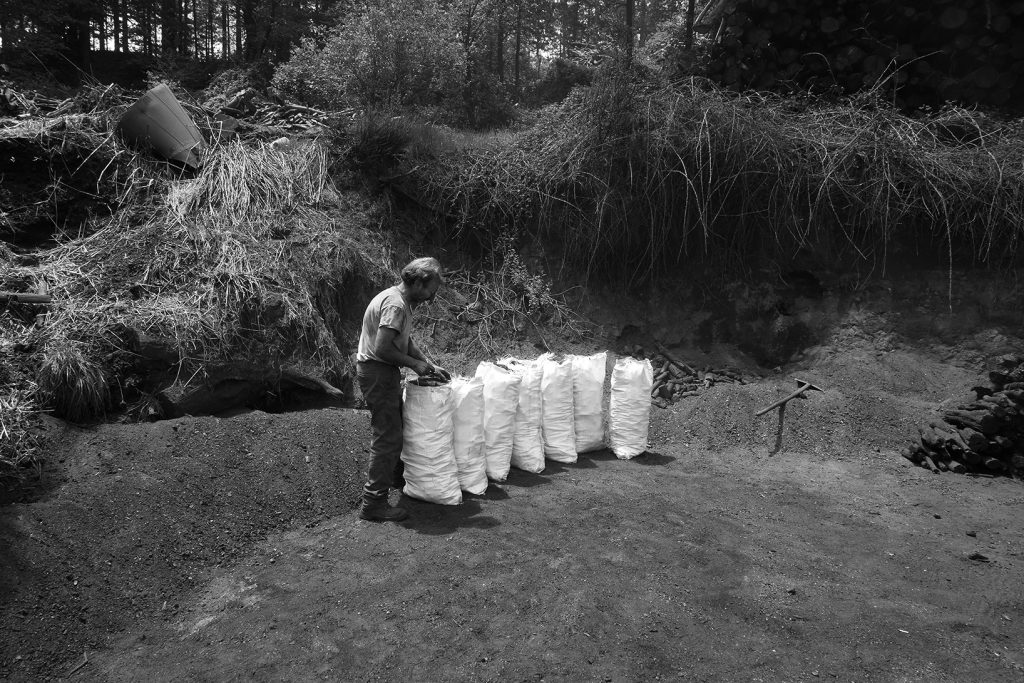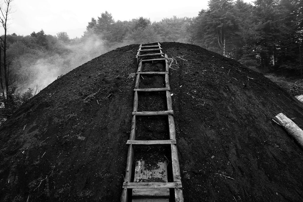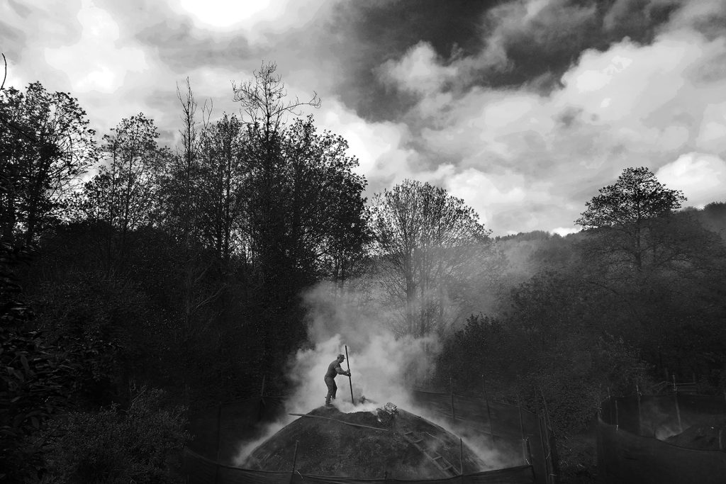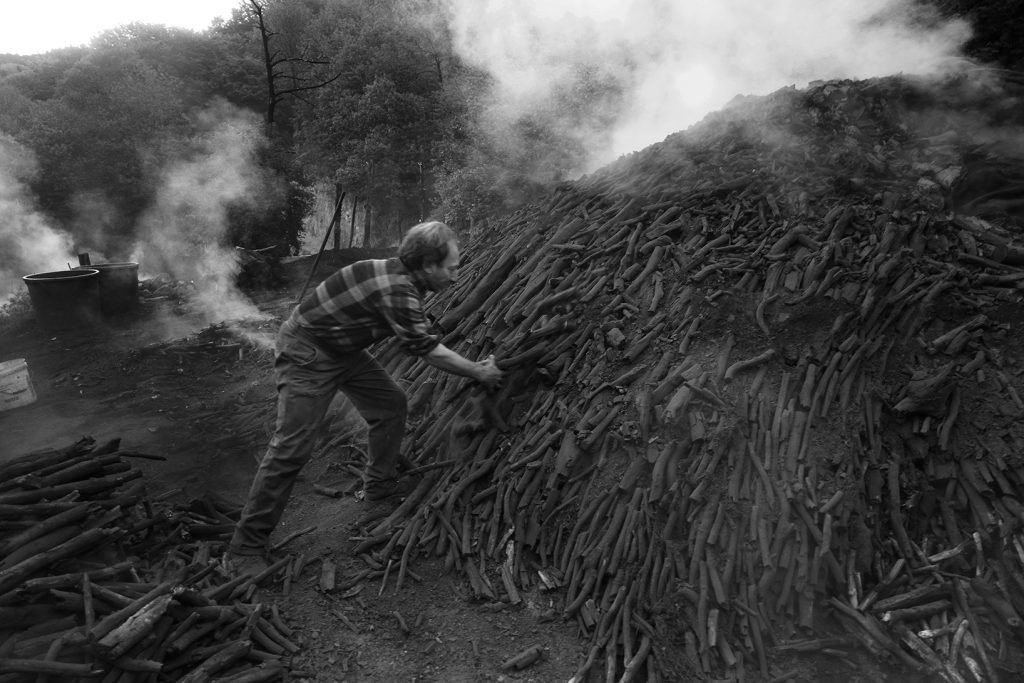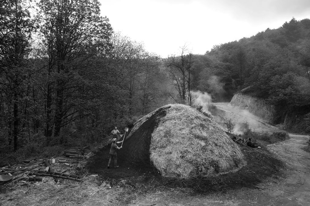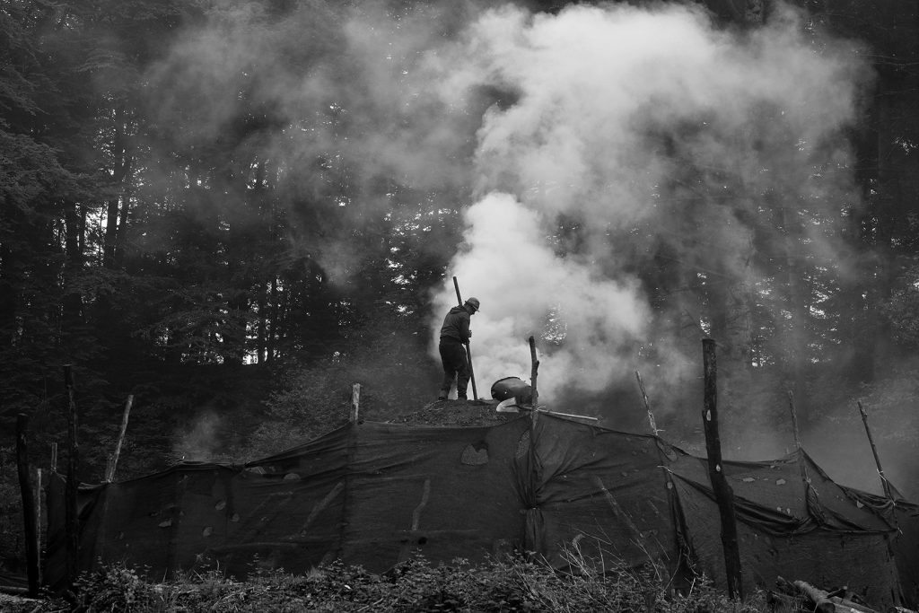 Camminando tra questi piccoli vulcani costruiti dall’uomo, osservo Angelo, 57 anni. Oggi è la giornata del «raccolto», una carbonaia ha finito il suo ciclo, ha trasformato tutta la legna in carbone. Bisogna scoperchiarla, togliere la terra, raccogliere e sistemare il carbone. Nuvole di polvere nera si alzano ovunque. Ma lui si muove rapido, sa da dove iniziare, impartisce brevi ordini e consigli al figlio che lavora con lui. In poco tempo il volto di entrambi è diventato una maschera nera. Risaltano solo gli occhi. Con esperienza dividono il carbone, nelle varie misure. Angelo, la schiena curva per raccogliere il carbone, si ferma raramente per riposarsi. E alza lo sguardo solo per controllare il fumo che esce dalle altre carbonaie.