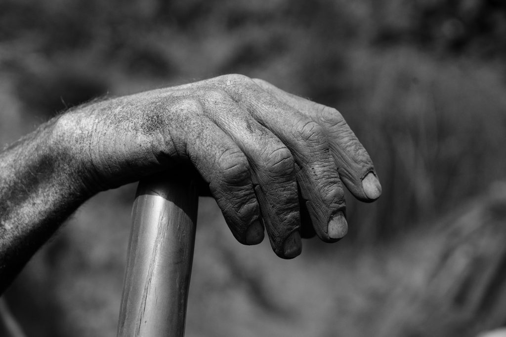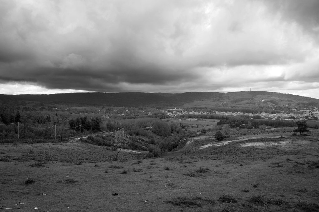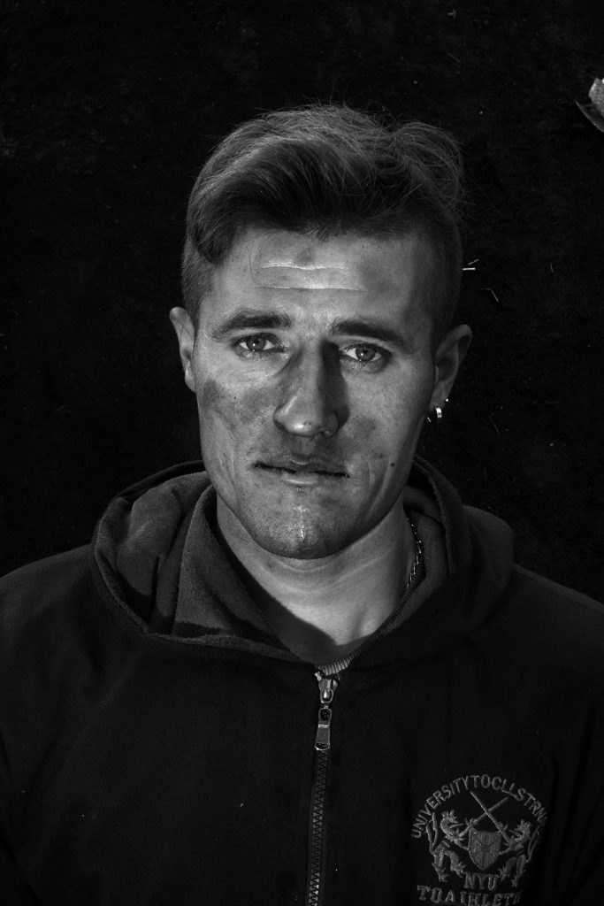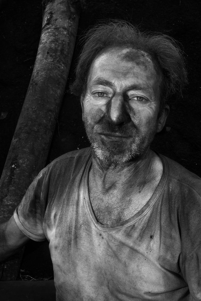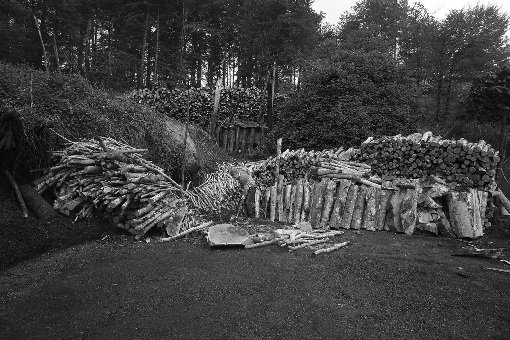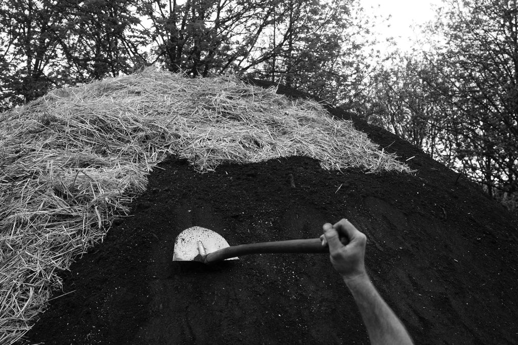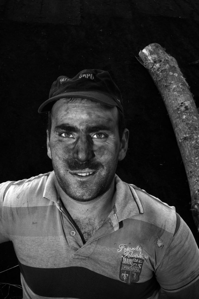 Camminando tra questi piccoli vulcani costruiti dall’uomo, osservo Angelo, 57 anni. Oggi è la giornata del «raccolto», una carbonaia ha finito il suo ciclo, ha trasformato tutta la legna in carbone. Bisogna scoperchiarla, togliere la terra, raccogliere e sistemare il carbone. Nuvole di polvere nera si alzano ovunque. Ma lui si muove rapido, sa da dove iniziare, impartisce brevi ordini e consigli al figlio che lavora con lui. In poco tempo il volto di entrambi è diventato una maschera nera. Risaltano solo gli occhi. Con esperienza dividono il carbone, nelle varie misure. Angelo, la schiena curva per raccogliere il carbone, si ferma raramente per riposarsi. E alza lo sguardo solo per controllare il fumo che esce dalle altre carbonaie.