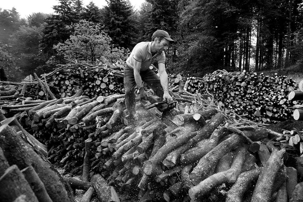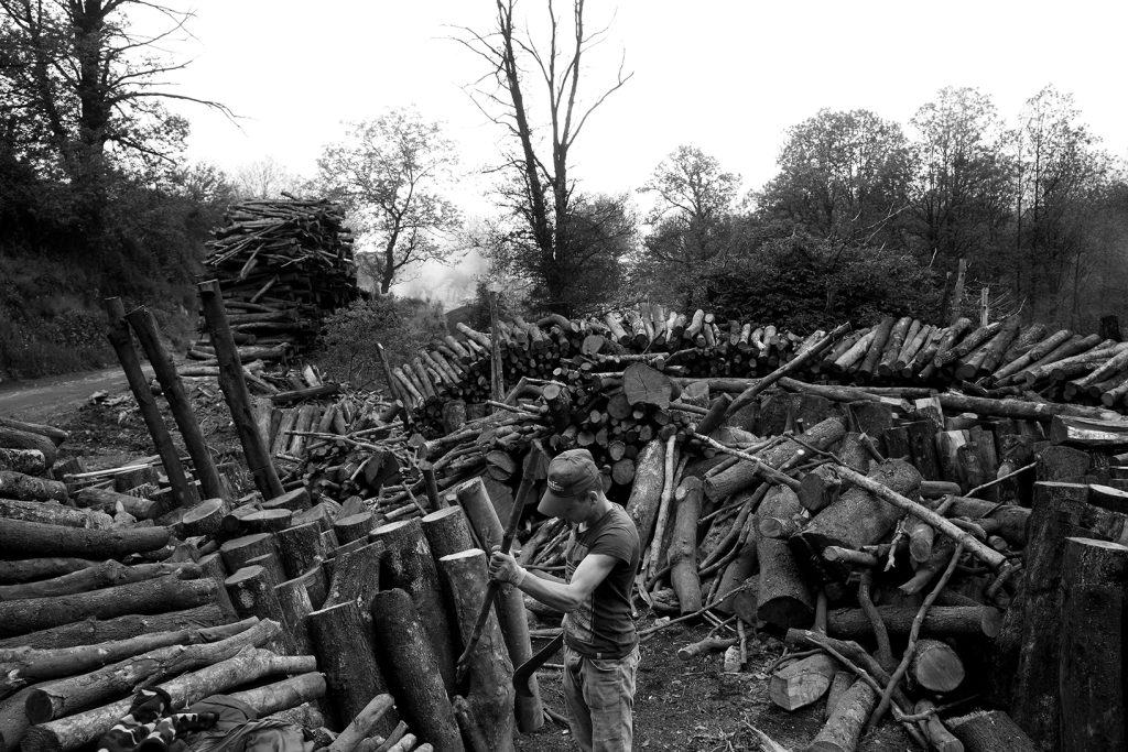 A 100 metri da Nazzareno e il figlio, il rumore della motosega è costante: Bruno taglia i tronchi a misura per costruire la nuova carbonaia. Procede spedito, sicuro dei suoi movimenti. È il più giovane dei tre fratelli, 46 anni, e ha sempre il sorriso sul volto. Un grande naso divide gli occhi scuri e vispi. Le mani callose. «Non andrei mai via di qui, io non sono mai andato via neanche una volta dalla mia terra non sono mai uscito dal territorio di Serra San Bruno», dice mentre sposta piccoli tronchi di legna, «mi piace vivere in mezzo al bosco, mi piace questo lavoro. E poi» continua mentre si accarezza la barba ispida, «faccio questo lavoro fin da piccolo, non riesco a staccarmene e non so fare altro».