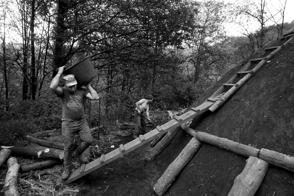 Si costruisce con la legna, con i tronchi più grandi al centro, che formeranno la caldaia, e con altri, sempre di diametro più piccolo verso l’esterno che costruiscono la carbonaia. Poi viene coperta di paglia e infine ricoperta di terriccio. Un lavoro che richiede 2 o 3 giorni. Dal foro in alto si inserisce la legna dentro la caldaia e si accende il fuoco. Il legno brucia e il fumo e il calore fanno diventare carbone i legni che circondano la caldaia. Il fumo del fuoco all’interno trova sfogo da piccoli fori ai lati o passa attraverso la paglia e la terra, oppure dal foro in alto. Queste cupole sono davvero piccoli vulcani costruiti dall’uomo.