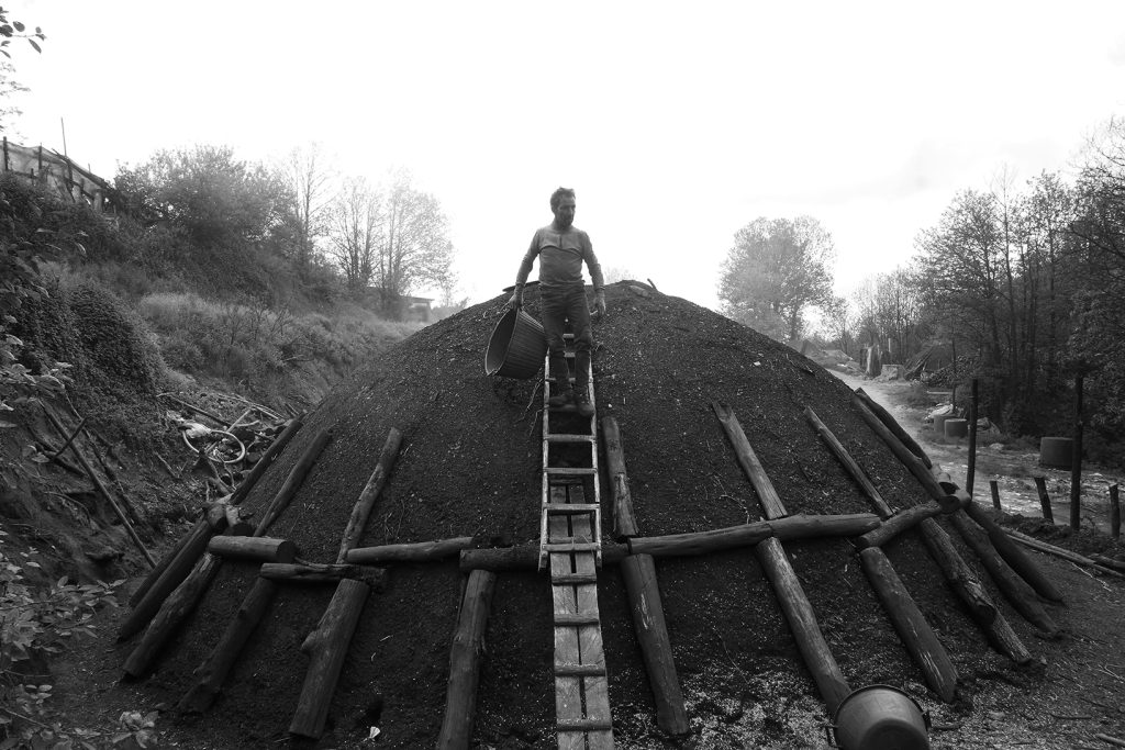 In base al colore del fumo, sa esattamente se tutto procede bene. E quando qualcosa non lo convince oppure quando è tempo di un controllo, va subito a vedere. Alla fine si ferma un attimo e appoggia la mano nera di carbone sul manico della sua pala. La sua maglietta bianca ormai è grigio scuro, così come i suoi pantaloni. Gocce di sudore scendono dalla fronte nera di polvere e scavano piccoli solchi. È davvero faticoso, non ti fermi mai, gli dico mentre manda giù un sorso di acqua fresca. Mi guarda come se avessi detto qualcosa di strano, e poi, incrociando le mani, mi dice: «La carbonaia mi dà da mangiare, ma è anche un lavoro di sacrificio, perché è lei che detta i ritmi, i tempi di lavoro, giorno e notte. E non puoi fermarti, non puoi rimandare, perché se non rispetti i tempi, il tuo lavoro va davvero in fumo». E si apre ad un sorriso, mostrando i denti che sembrano più bianchi di quello che sono.