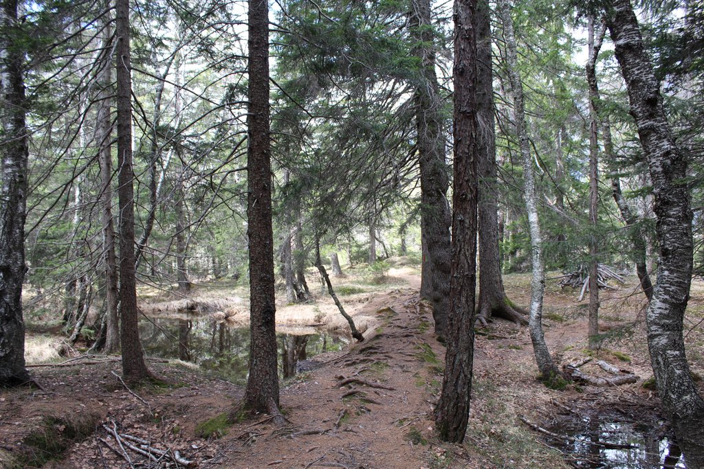 Poco lontano c’è la sosta presso la torbiera della Bedrina, un biotopo d’importanza nazionale che conserva una vegetazione tipica di palude e rappresenta la parte più preziosa e delicata dell’omonima zona protetta. Qui s’invita a riflettere sull’importanza delle torbiere e anche ad aguzzare la vista alla ricerca di alcune specie tipiche e fragili di questi ecosistemi, come la Rosolida a foglie rotonde, una minuscola piantina carnivora, il Dragone alpino, una libellula con straordinarie abilità di volo, oppure il Pennacchio guainato, una pianta erbacea perenne dai frutti pelosi. Specie che in determinati periodi (fine maggio-inizio giugno per il Pennacchio, fine luglio-inizio agosto per le altre due specie citate), con buono spirito d’osservazione e anche un po’ di fortuna si potranno scovare presso la torbiera della Bedrina la quale deve il suo nome alla Betulla, bédra nel dialetto locale, un albero pioniere tra i primi a fare il suo ritorno dopo il ritiro dei ghiacciai.