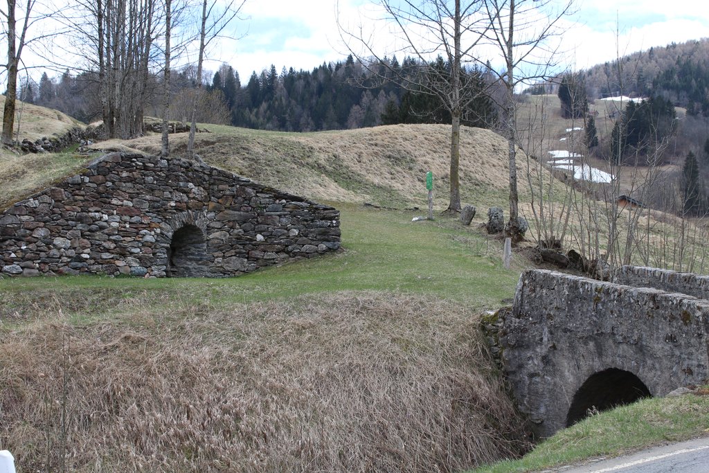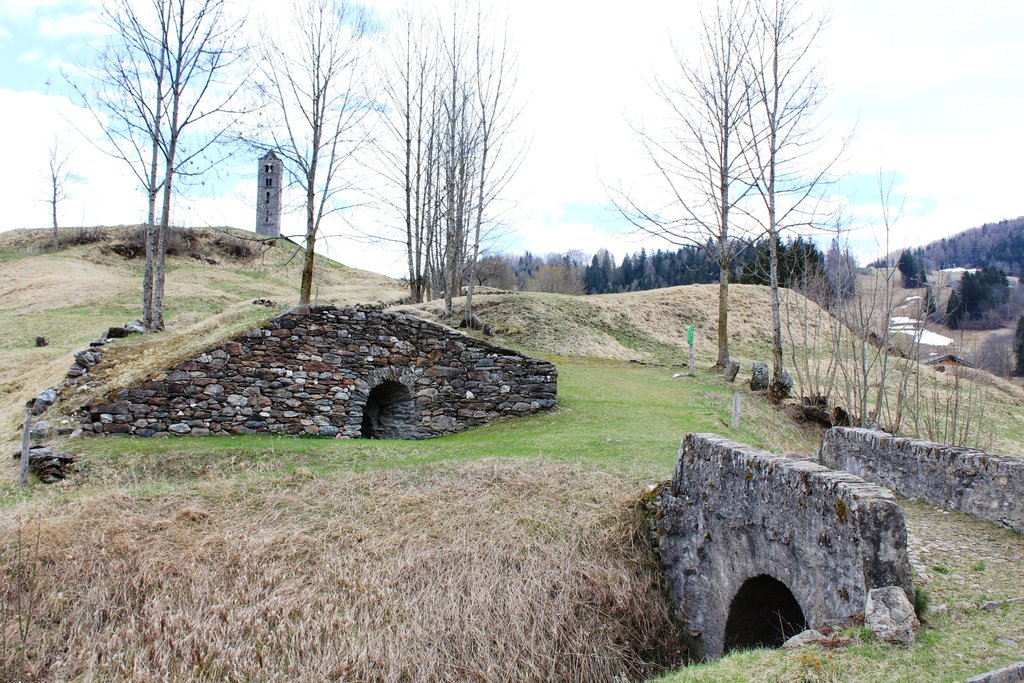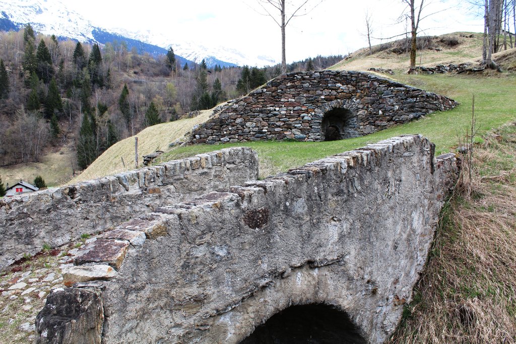 Poco sotto il nucleo di Prato Leventina, in prossimità della chiesa di San Giorgio e a due passi dalla strada carrozzabile, il sentiero tocca due costruzioni poste a pochi metri l’una dall’altra, un ponte «romano» e una fornace. Il ponte, in realtà non risale all’epoca romana: faceva parte del percorso che collegava Faido al Gottardo passando per Piana Selva e il Dazio Antico. Un’opera che perse d’attualità verso il 1350 con la costruzione della mulattiera sul lato destro del Piottino. La fornace è invece più recente ed è stata utilizzata per la produzione di calce sino agli inizi del XX secolo, per poi perdere d’attrattività con l’avvento del cemento o altri materiali e con lo sviluppo della rete viaria che rese più facile l’accesso ad altre zone dove c’era del materiale calcareo migliore. Della fornace si possono ancora vedere le mura con la bocca di fuoco, di carico e scarico dove venivano cotte le pietre frantumate e contenenti calcare.