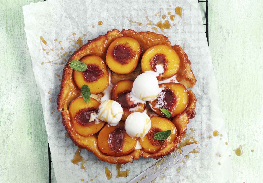 7. Scaldate il forno ventilato a 220 °C. Cuocete la torta fredda al centro del forno per circa 15 minuti. Sfornatela e lasciatela riposare brevemente. Coprite la tortiera con un piatto da portata o per torte e sformate la torta capovolgendola. Fate attenzione a non ustionarvi con il caramello bollente. Servite la Tarte Tatin tiepida.