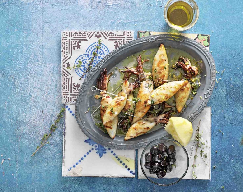 2. Preriscaldate il grill a 220 °C. Sciacquate bene i calamari sotto l’acqua corrente e tamponateli con carta da cucina. Riempite i calamari con la farcia di spinaci, avendo cura di spingerla fino in fondo con il manico di un cucchiaio. Lasciate un po’ di spazio alla fine per chiudere i calamari con uno stuzzicadenti. Spennellate i calamari con 2 cucchiai d’olio. Grigliateli a fuoco medio per 8-10 minuti. Disponeteli su un piatto, irrorateli con l’olio rimasto e spruzzateli con il succo di limone. Condite i calamari con la fleur de sel e, a piacere, guarniteli con scorza di limone grattugiata.