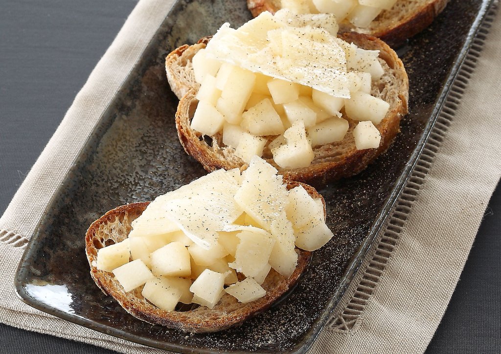 Ingredienti per 4 persone: 4 fette di pane buono · 2 pere a piacere · aglio · formaggio grana o sbrinz o altro a piacer vostro · olio di oliva · sale e pepe.