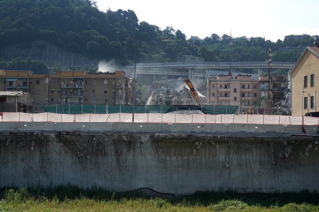Poco dopo quella triste data sono iniziati i lavori di ricostruzione. Prima hanno iniziato a demolire quello che era rimasto in piedi: i moncherini del ponte, le case sotto e accanto a dove era stato costruito. Ma demolire è molto più difficile che costruire. E dopo aver ripulito dalle macerie, aver permesso ai residenti di portare via le loro cose dalle case in cui non potevano più stare, sigillato i palazzi, chiuso le strade, smontato alcuni pezzi del ponte, a inizio giugno di quest’anno è iniziata la demolizione dei palazzi. Il giorno 28 alle 9,38 c’è stata l’esplosione che ha fatto crollare definitivamente quello che era rimasto del viadotto. Solo una parte di una pila oggi è ancora in piedi, sul lato di Cornigliano. Nel Ponte Morandi, nelle sue macerie, c’è amianto, la polvere tossica, e la preoccupazione dei cittadini per la propria salute è forte.
