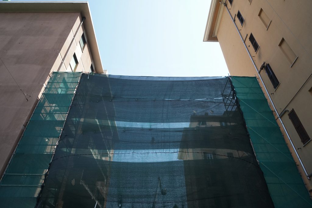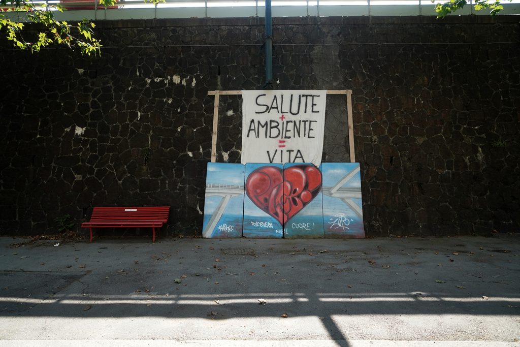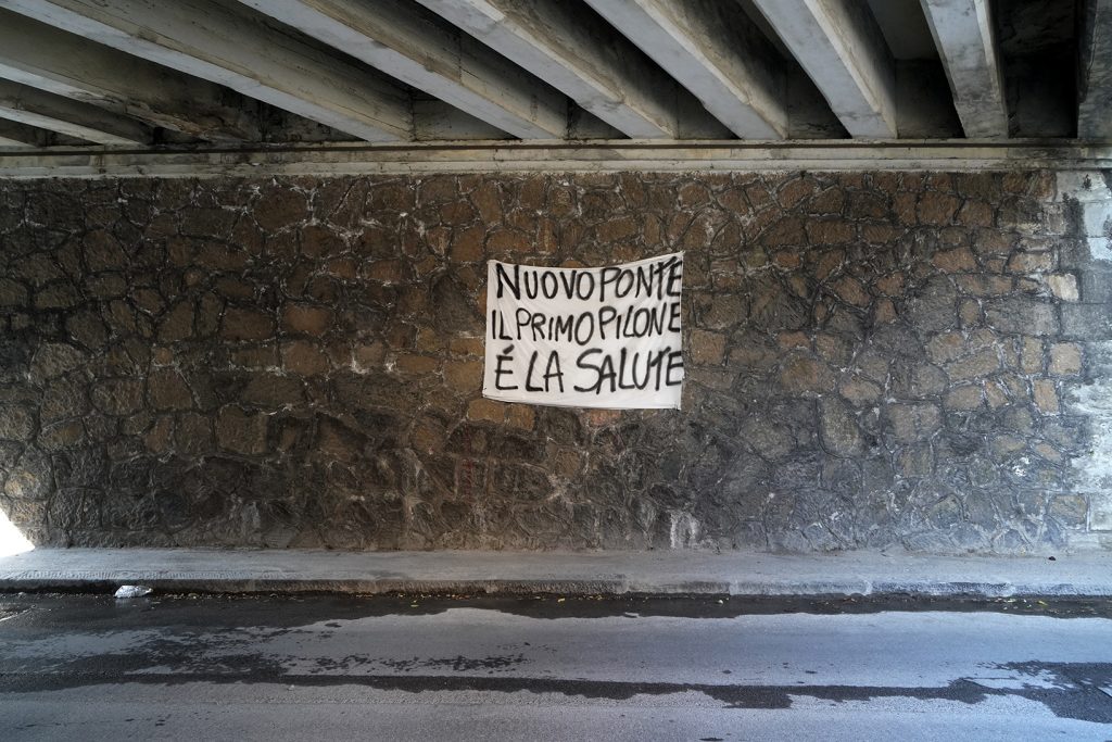 Lungo una salita in cerca di un punto «panoramico» interessante, mi imbatto in Ferdinando, calabrese, capelli bianchi arruffati e mani da operaio. Mi conduce in un luogo dove riesco a vedere le macerie del ponte: pezzi di ferro, cemento, calcinacci, un pezzo di asfalto che una volta era l’autostrada. Camion e operai in continuo movimento. Se allungavi la mano, mi spiega, da qui ti sembrava quasi di toccare il ponte. Per 19 anni ho visto le auto sfrecciare, ho sentito il rombo dei loro motori. Sto per congedarmi da lui quando,  con voce profonda e ferma, mi dice: «Sai quale è il ricordo che conserverò per sempre di quel giorno? Il silenzio che è seguito a quel devastante rumoroso crollo».