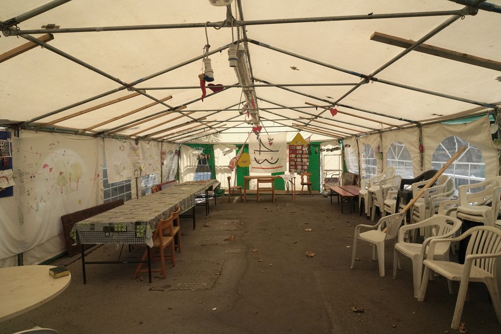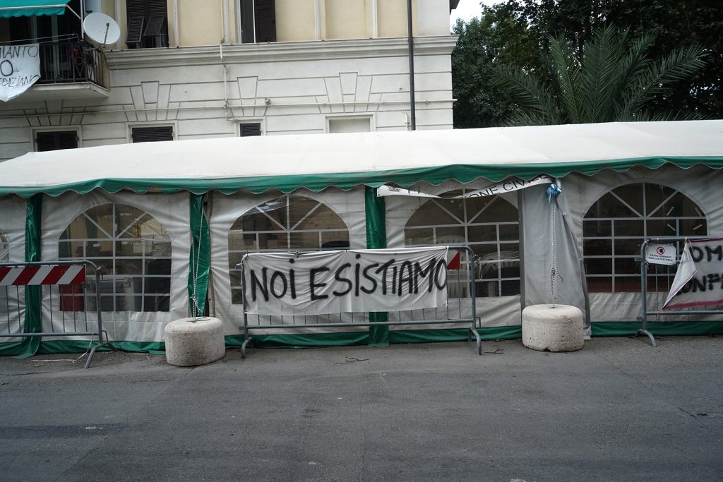 Via Porro è lì, dietro l’angolo. Se ne possono percorrere solo un centinaio di metri e poi blocchi di cemento e transenne bloccano la strada. È l’inizio della zona rossa e un alto telone verde preclude la vista su quello che succede dall’altra parte. Si può intuire, dal rumore delle ruspe e dei martelli pneumatici: le ultime case stanno per essere abbattute. Poco lontano, un tendone bianco è la sede del comitato degli inquilini e degli sfollati coinvolti dal crollo. Si riuniscono qui per decidere che cosa fare, condividere informazioni, esperienze, chiedere aiuto. In fondo, su un telo bianco appare il numero 43, che ricorda il numero delle vittime.