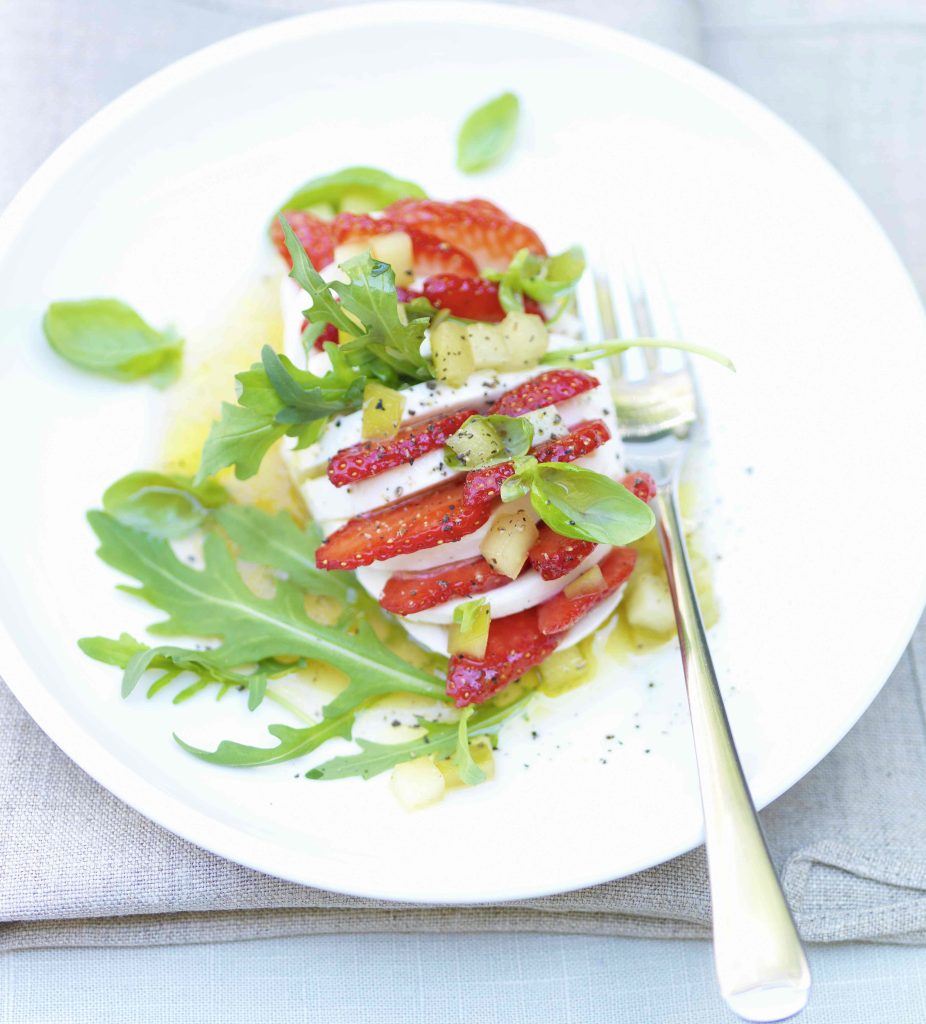 La caprese in versione dolce: le nuove partner della mozzarella sono le fragole. Un po’ di rucola, basilico e succo di mela e l’estate è pronta per essere servita.