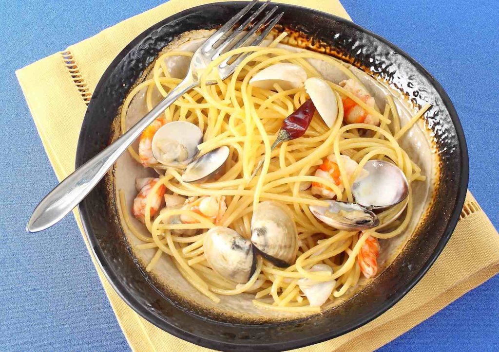 Ingredienti per 4 persone: 320 g di spaghetti · 1,2 kg di vongole · 12 code di scampi · peperoncino piccante · vino bianco · olio d’oliva · sale