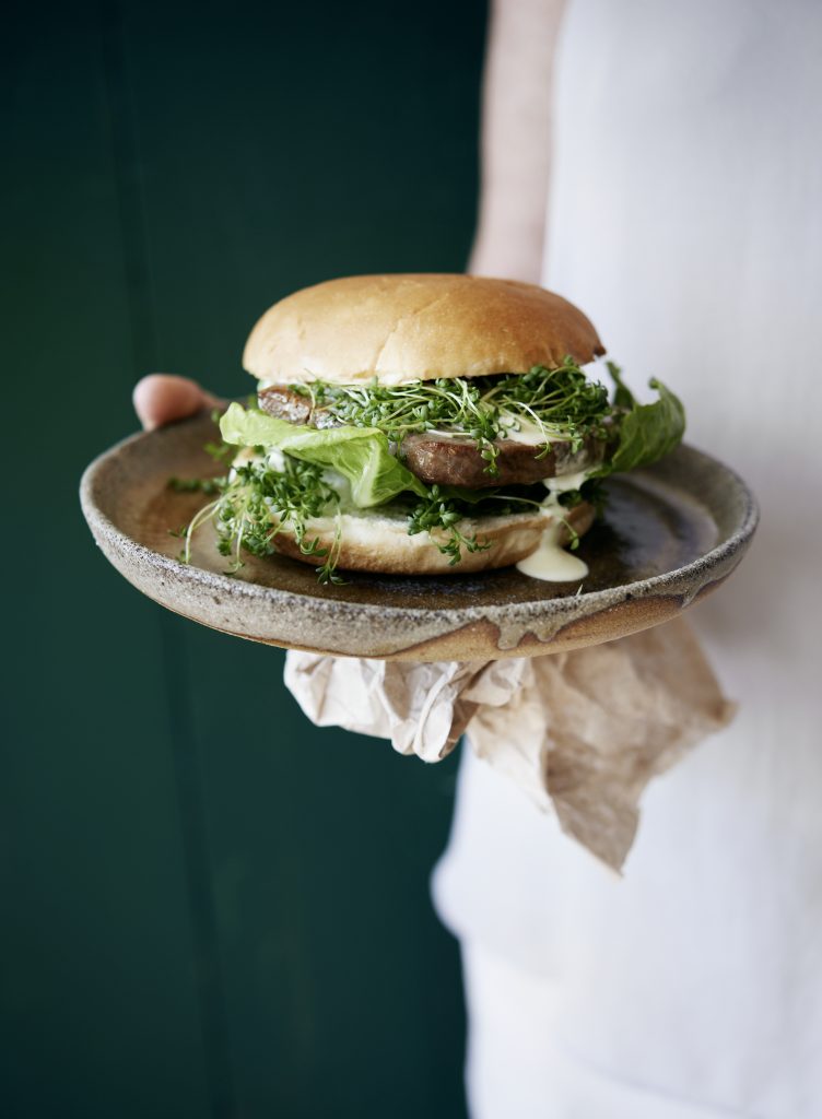 2. Dimezzate i panini per burger, tostateli. Spezzettate le foglie d’insalata. Distribuitele sulla metà inferiore dei panini assieme a metà del crescione. Rosolate brevemente il tonno da entrambe le parti a fuoco medio. Adagiatelo sulle foglie d’insalata assieme al crescione rimasto, coprite con la metà superiore dei panini.Servite subito con la salsa.
