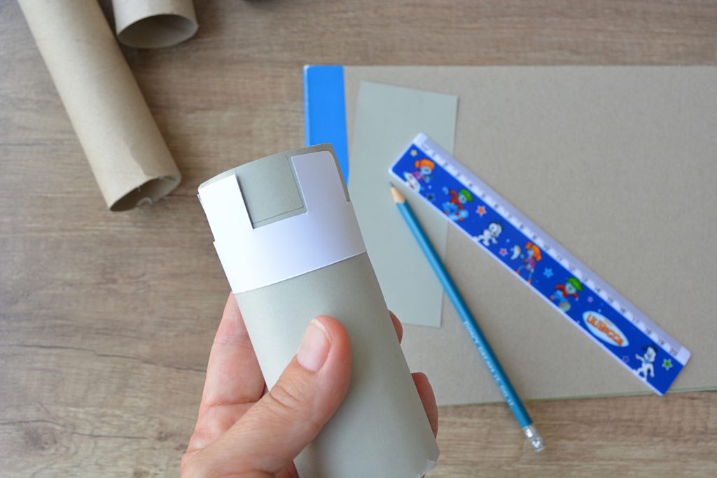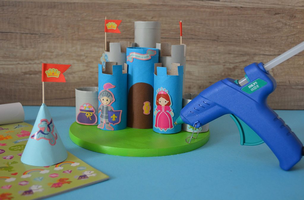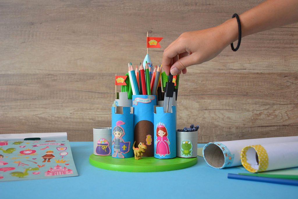 Dipingete la base di verde con la pittura acrilica e fissate la vostra composizione di tubi alla base. Create il tetto alla torre principale con un compasso o utilizzando un cd come misura, tagliate un cerchio dal cartoncino celeste e dividetelo in due parti. Avvolgetelo a cono e incollate i due lati. Con gli stuzzicadenti e un resto di cartoncino rosso create le bandiere. Ora non vi resta che decorare il castello coi vostri adesivi preferiti, riempirlo con le vostre matite e colori e sistemare il vostro nuova porta tutto in bella mostra sulla scrivania.