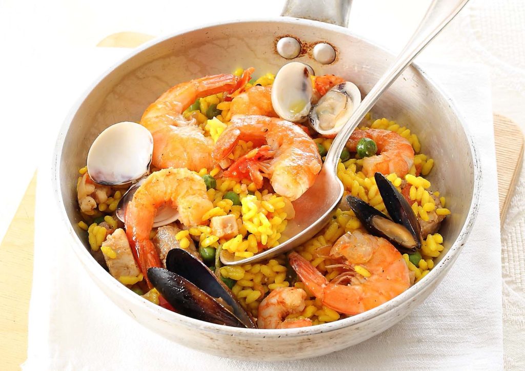 Ingredienti per 4 persone: 360 g di riso · 16 code di gamberi · 24 cozze · 24 vongole ben spurgate · 8 pomodorini · 100 g di piselli surgelati grossi · 1 cipolla · 1 bustina di zafferano · brodo di pesce o di verdure · olio di oliva · sale e peperoncino.