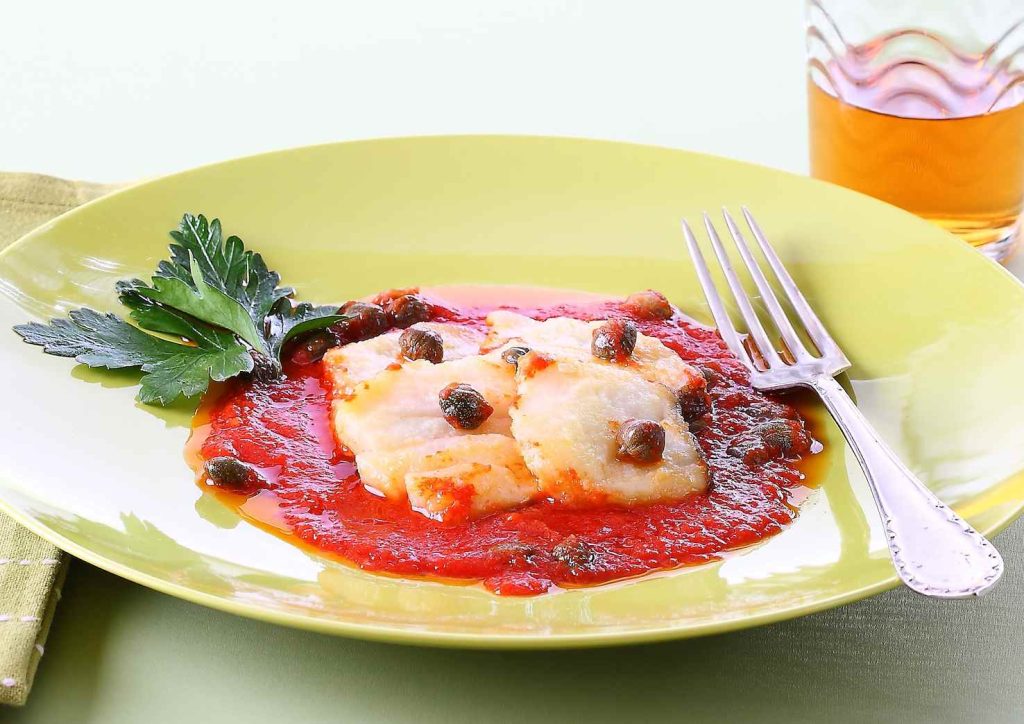 Ingredienti per 4 persone: 800 g di baccalà già bagnato in trance · farina · 200 g di polpapronta di pomodoro · soffritto di cipolla · capperi sott’aceto · aglio · prezzemolo · olio di oliva · sale e paprika.