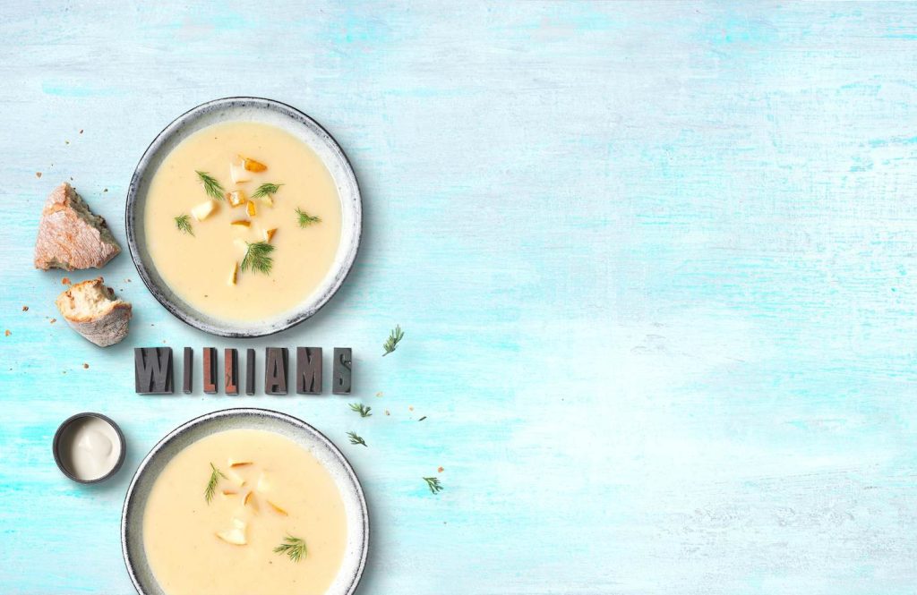 Ingredienti per 4 persone: 350 g di sedano rapa · 1 cipolla · 1 spicchio d’aglio · olio per cuocere · 1,2 l di brodo di verdura · ½ limone · 0,5 dl Williams · 1 pera · sale · pepe · 4 c di crème fraîche · 1 rametto d’aneto.