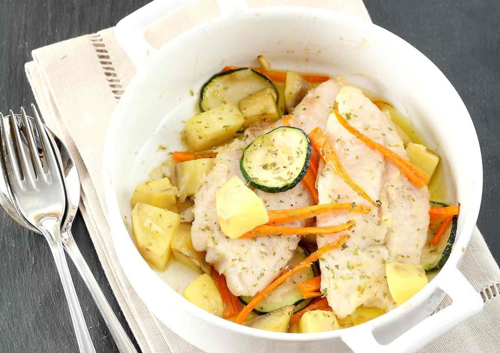 Ingredienti per 4 persone: 600 g di filetti di pesce bianco · 2 patate · 1 carota · 2 zucchine · 1 grossa cipolla · origano · vino bianco secco · olio do oliva · sale e pepe.