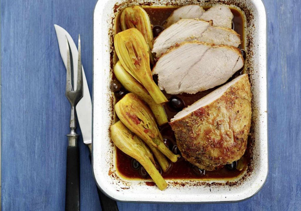 3. Abbassate la temperatura a 170 °C. Dimezzate i finocchi. Estraete i pelati dal loro succo. Quest’ultimo potete conservarlo per preparare una minestra. Distribuite intorno alla carne i pelati, i finocchi tagliati a metà e le olive. Versate il fondo bruno. Mettete il coperchio e stufate in forno per 50-60 minuti. Dopo 30 minuti di cottura togliete il coperchio e terminate la cottura senza coperchio. Tagliate l’arrosto a fette spesse e servitele con i finocchi e le olive.