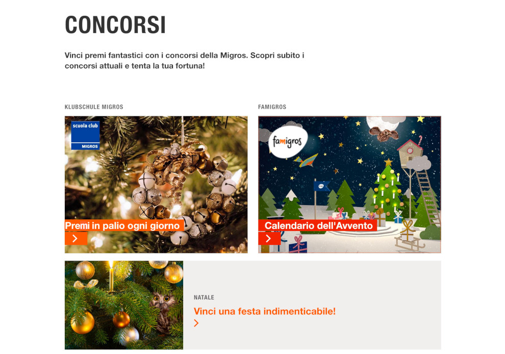 In particolare in questo periodo sono attivi i concorsi natalizi legati al Calendario dell’Avvento di Famigros e quello «Vinci una festa indimenticabile!», che mette in palio una spesa da 5000 franchi oltre a 40 carte regalo Migros settimanali.