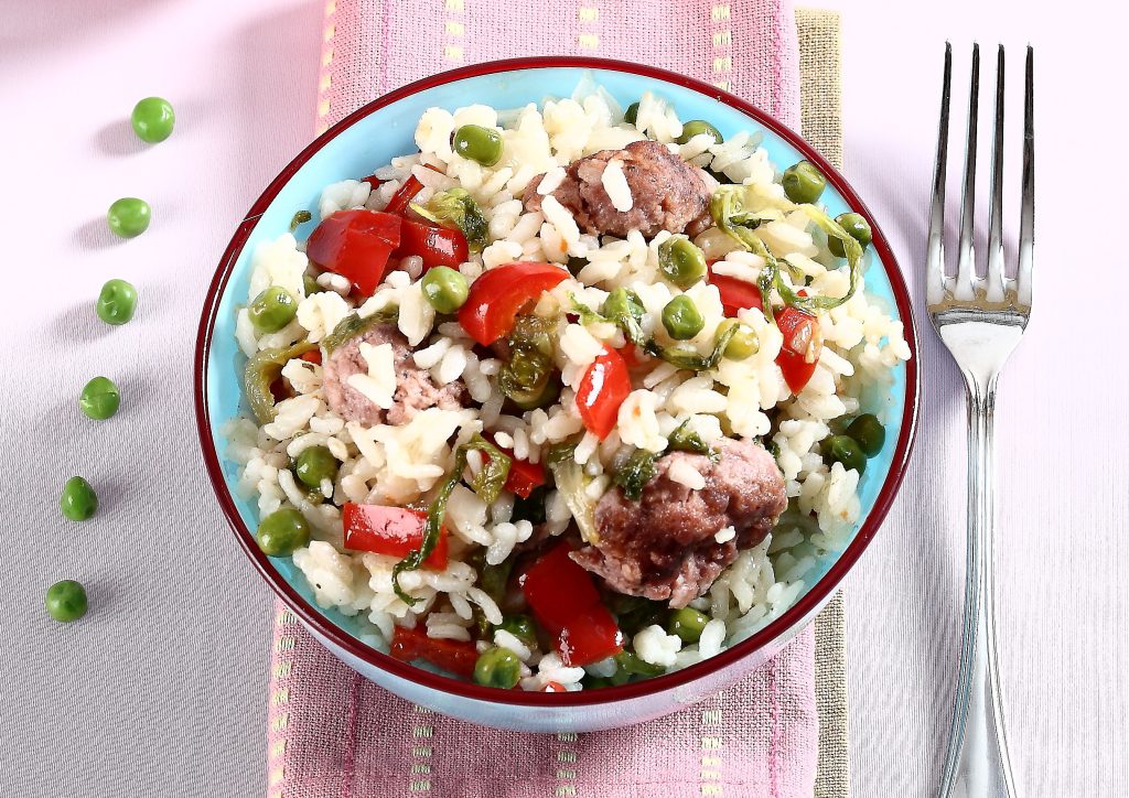 Ingredienti per 4 persone: riso g 320 · salsiccia g 240 · 1 peperone rosso · 1 cuore di lattuga · piselli g 100 · soffritto di cipolle · brodo di carne · burro · sale.