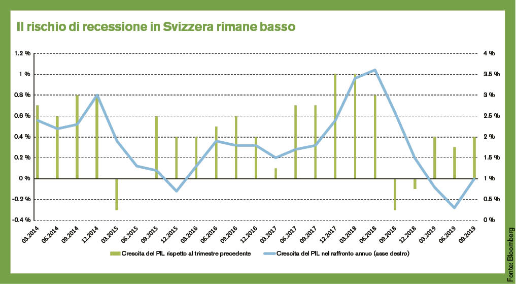 Nel terzo trimestre del 2019 l’economia svizzera ha registrato un andamento leggermente migliore del previsto: il prodotto interno lordo (PIL) è cresciuto dello 0,4% rispetto al trimestre precedente, a fronte di una crescita pari allo 0,3% nel secondo trimestre. La leggera accelerazione della crescita è dovuta principalmente all’esportazione di prodotti chimici e farmaceutici e di energia. Mentre l’industria chimico-farmaceutica ha confermato uno sviluppo dinamico, il settore energetico ha beneficiato di condizioni meteorologiche favorevoli e ha registrato il più forte incremento nella sua storia. Nel complesso, la crescita dell’industria manifatturiera si è attestata all’1,2%.