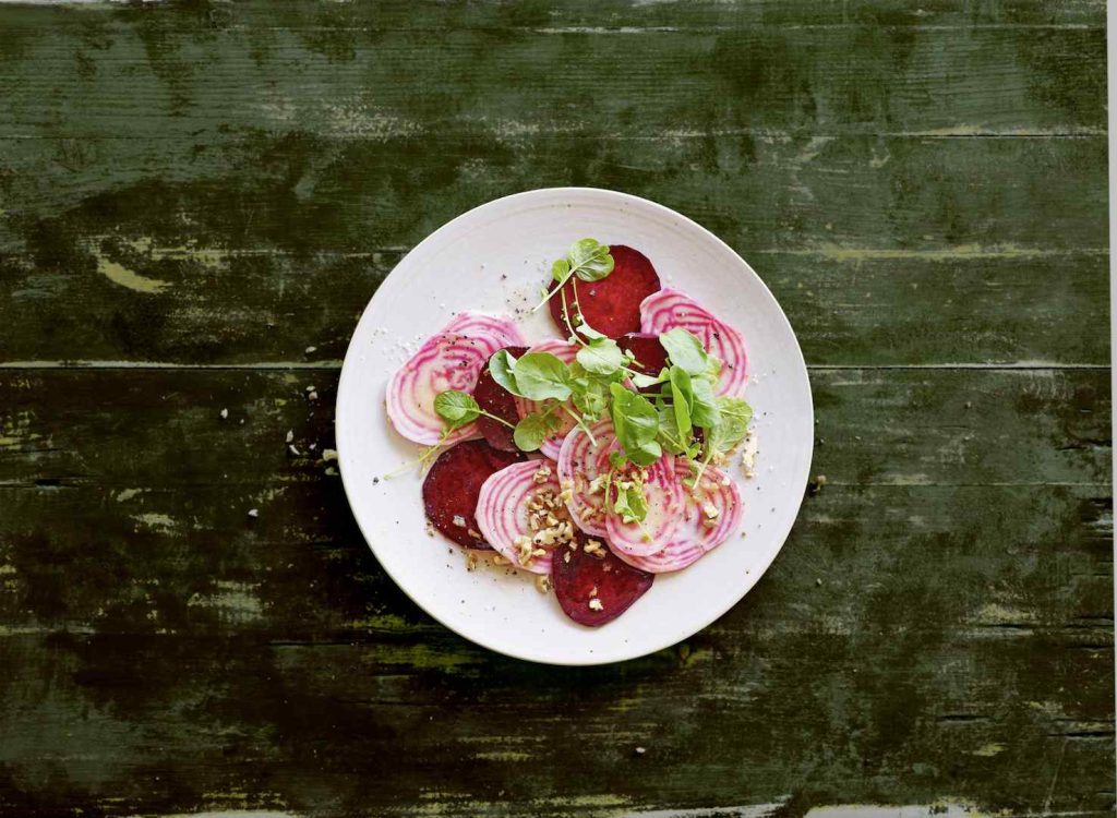 3. Accomodate le barbabietole nei piatti, conditele con la salsa e cospargetele con le briciole di noci e pangrattato. Guarnite con il crescione d’acqua.